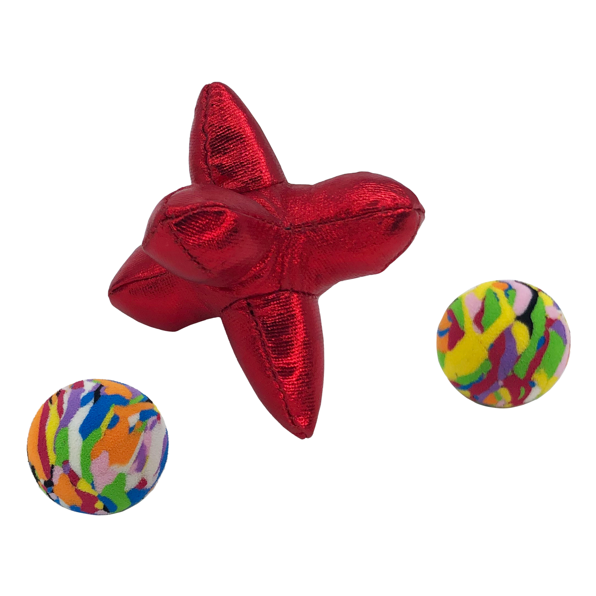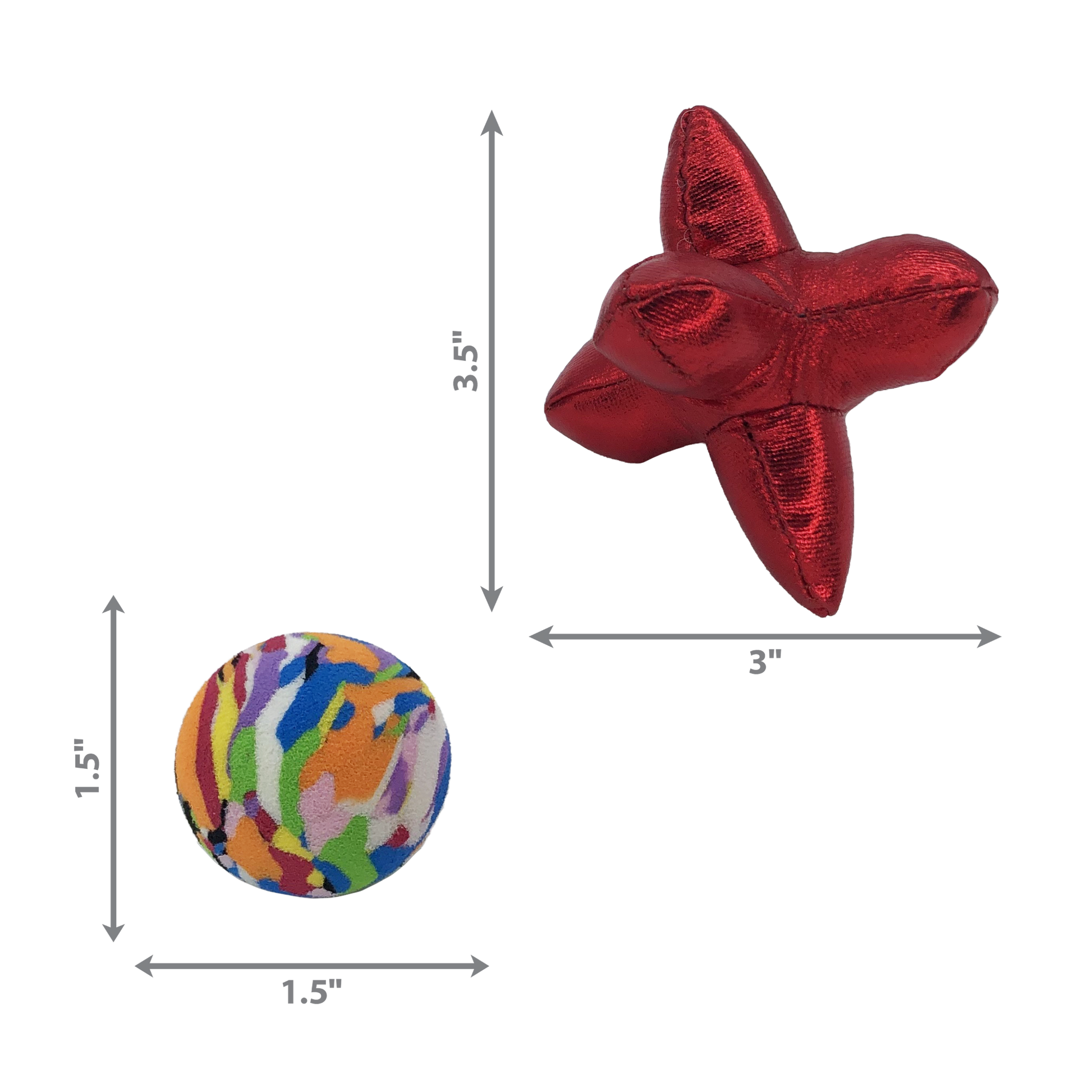 KONG Cat Active Jacks toss 3 toys into play with kitty-tempting spins on traditional fun in super lightweight toys that spark action. Fast-rolling, bouncy balls and easy-to-flip jack invite pouncing and batting play. KONG North American Premium Catnip and crackle in shiny Jack prolong engagement for tons of healthy exercise.