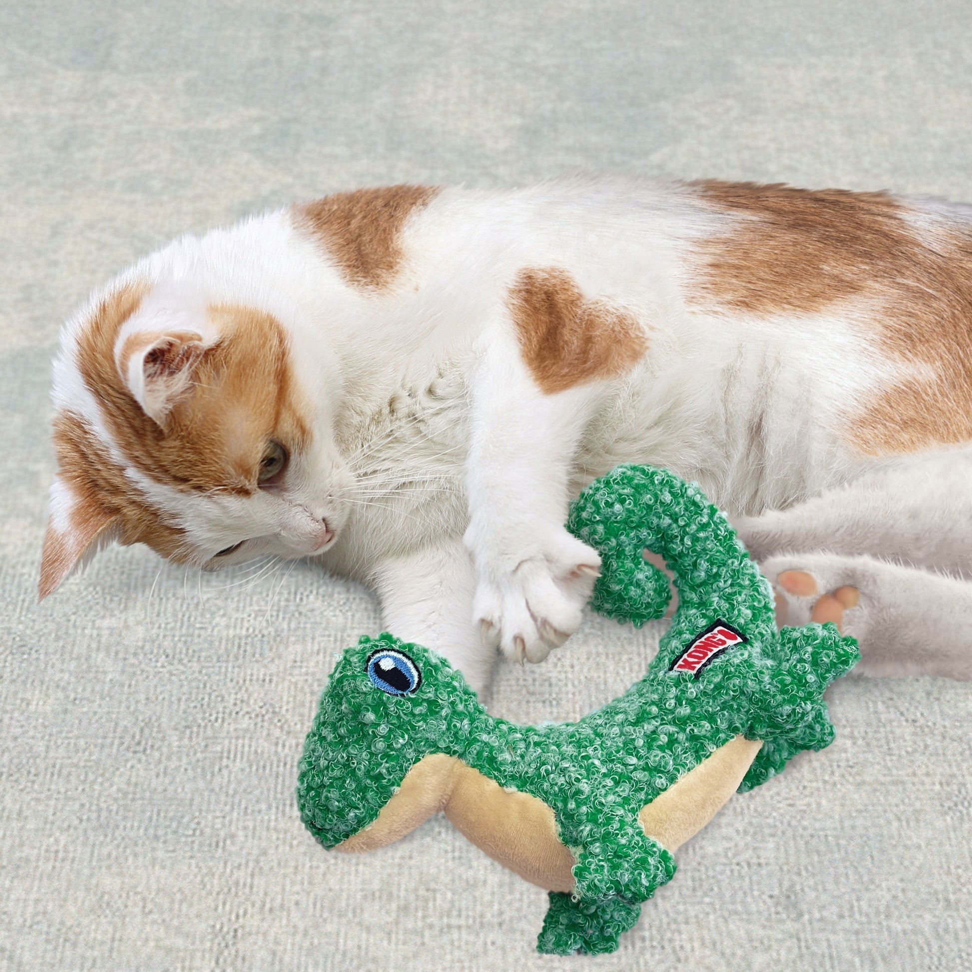 Oversized cat toy ideal for wrestling, hind paw kicking, and cuddling . Textured outer material with inner crackle sparks hunting instincts . Tail, feet, and head features are easy for cats to capture . KONG Premium North American Catnip inside for energetic play . Ideal for solo play