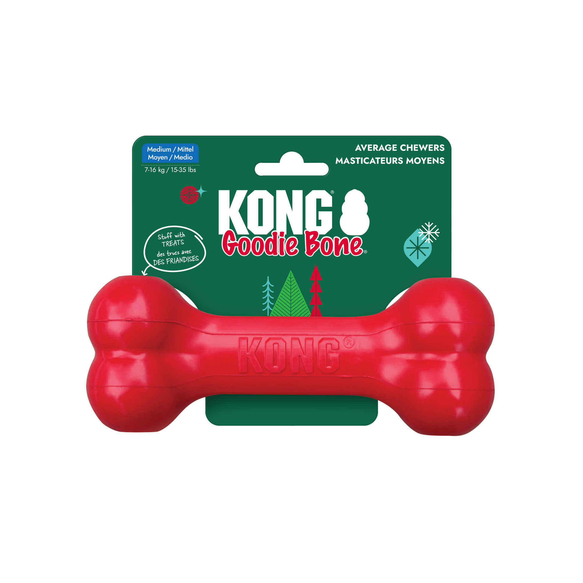 Average Chewers . Durable natural KONG Rubber, bone shaped for chewing satisfaction . Durable natural KONG Rubber; bone shaped for chewing satisfaction . Patented Goodie Gripper™ holes are ideal for stuffing challenges . Two Goodie Grippers™ extend the mind-occupying challenge 100% Rubber (Natural)