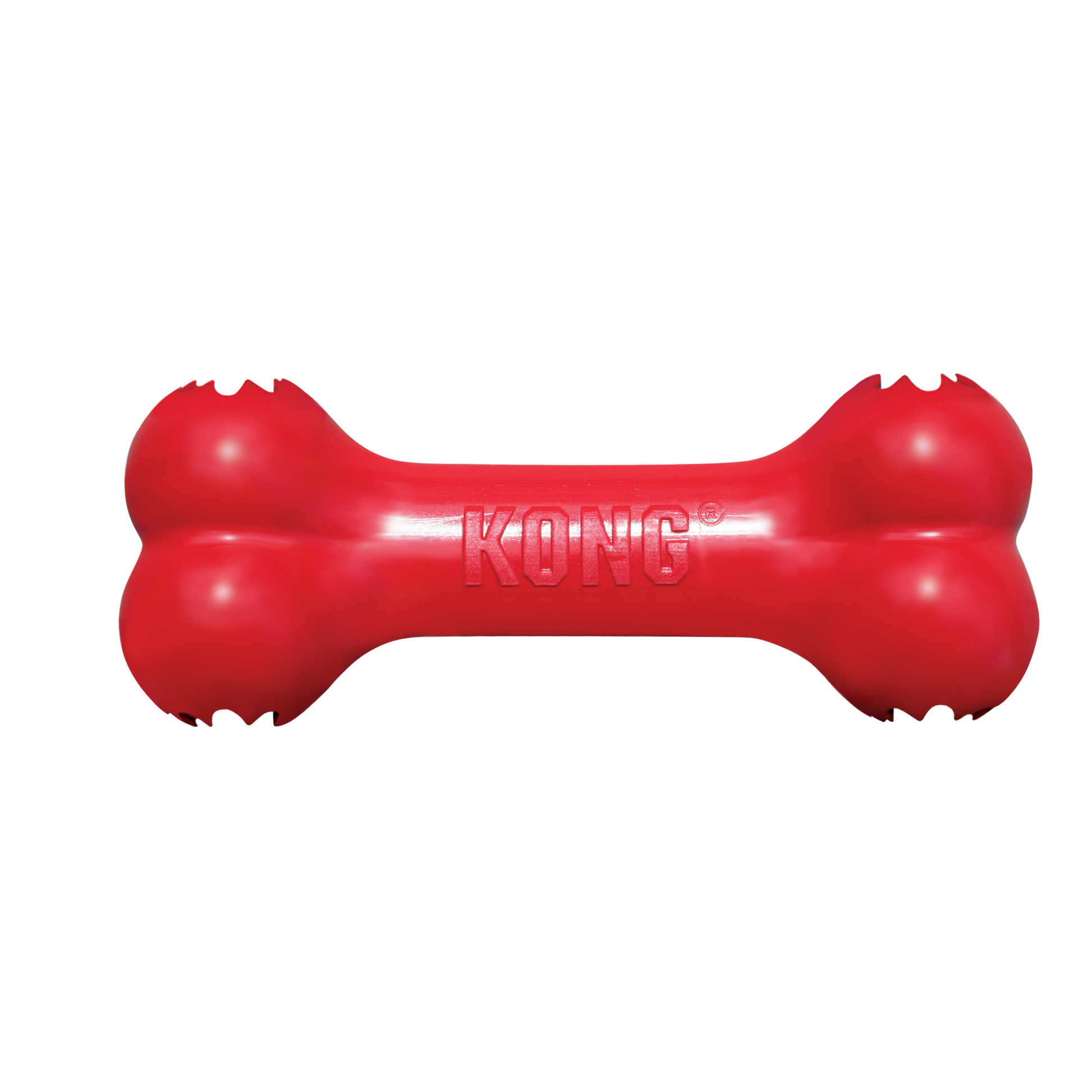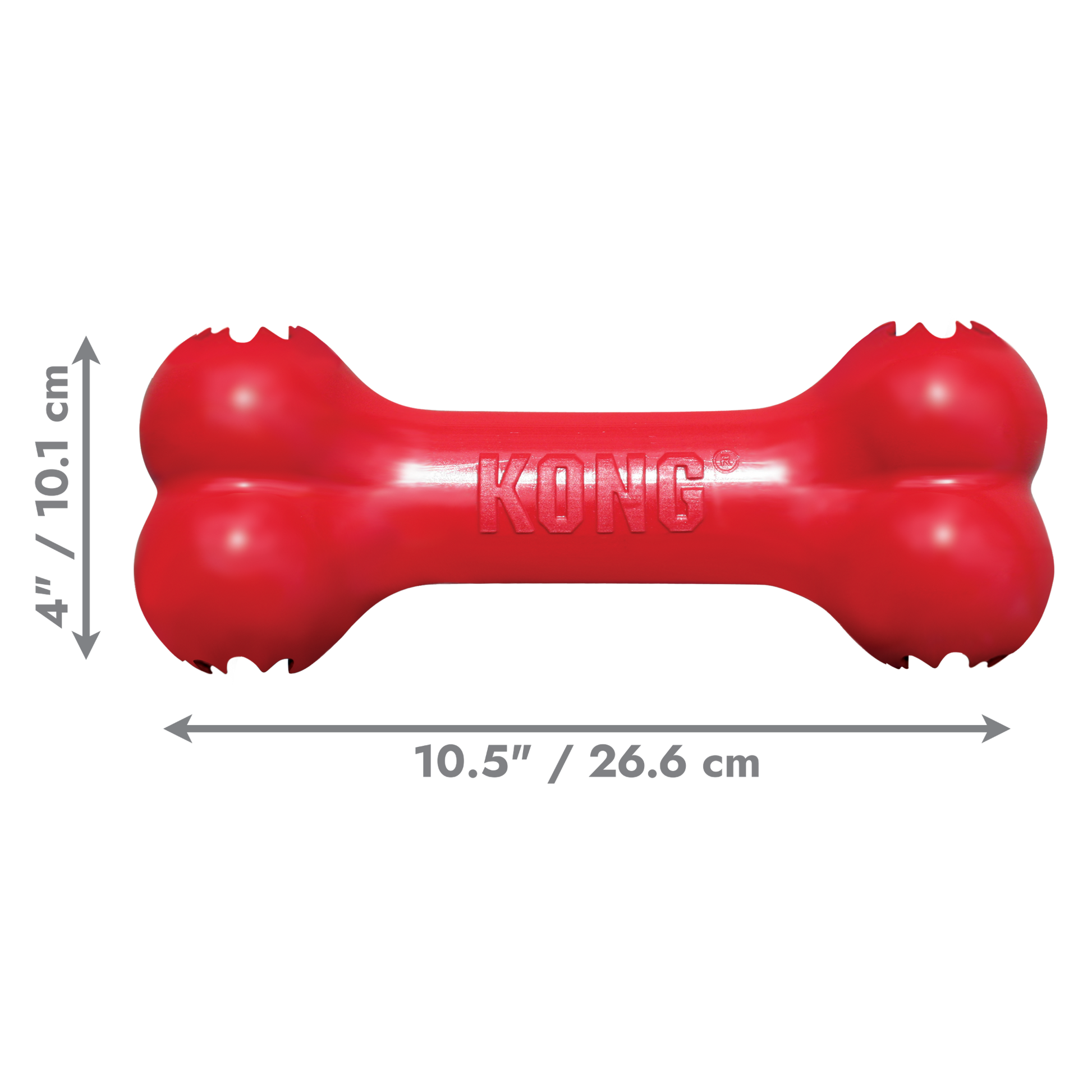 Promotes healthy teeth and gums . Stuff with treats, pastes, or peanut butter . Durable natural KONG Rubber; bone shaped for chewing satisfaction . Extra large size ideal for dogs 60-80lbs. . Made in the USA. Globally Sourced Materials.