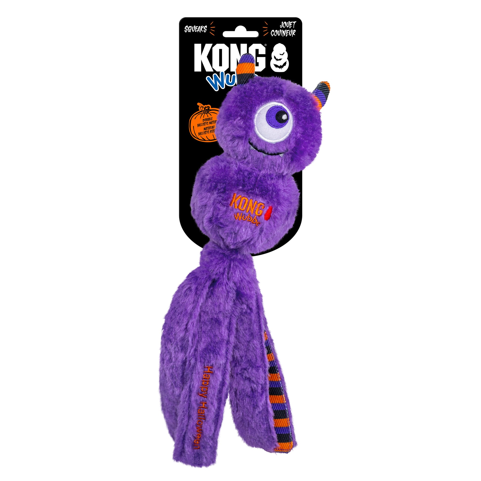 This monster prefers snuggling in bed to lurking underneath it. KONG Halloween Wubba Monster features a long, floppy tail to ignite dogs' shaking instincts, adding fun and excitement to tugging sessions! This purple monster is covered with soft, plush material, making it gentle on dogs' teeth. Plus, its long tails make it easy to pick up, throw, and fetch. Our Halloween Wubba is perfect for both interactive and independent play—complete with a squeaker that emits a mighty roar to signify it's time to mash some monsters! Its soft fur makes this Wubba not only a perfect cuddle buddy for nap time, but also a comforting toy that your dog can carry around the house and show off to friends.