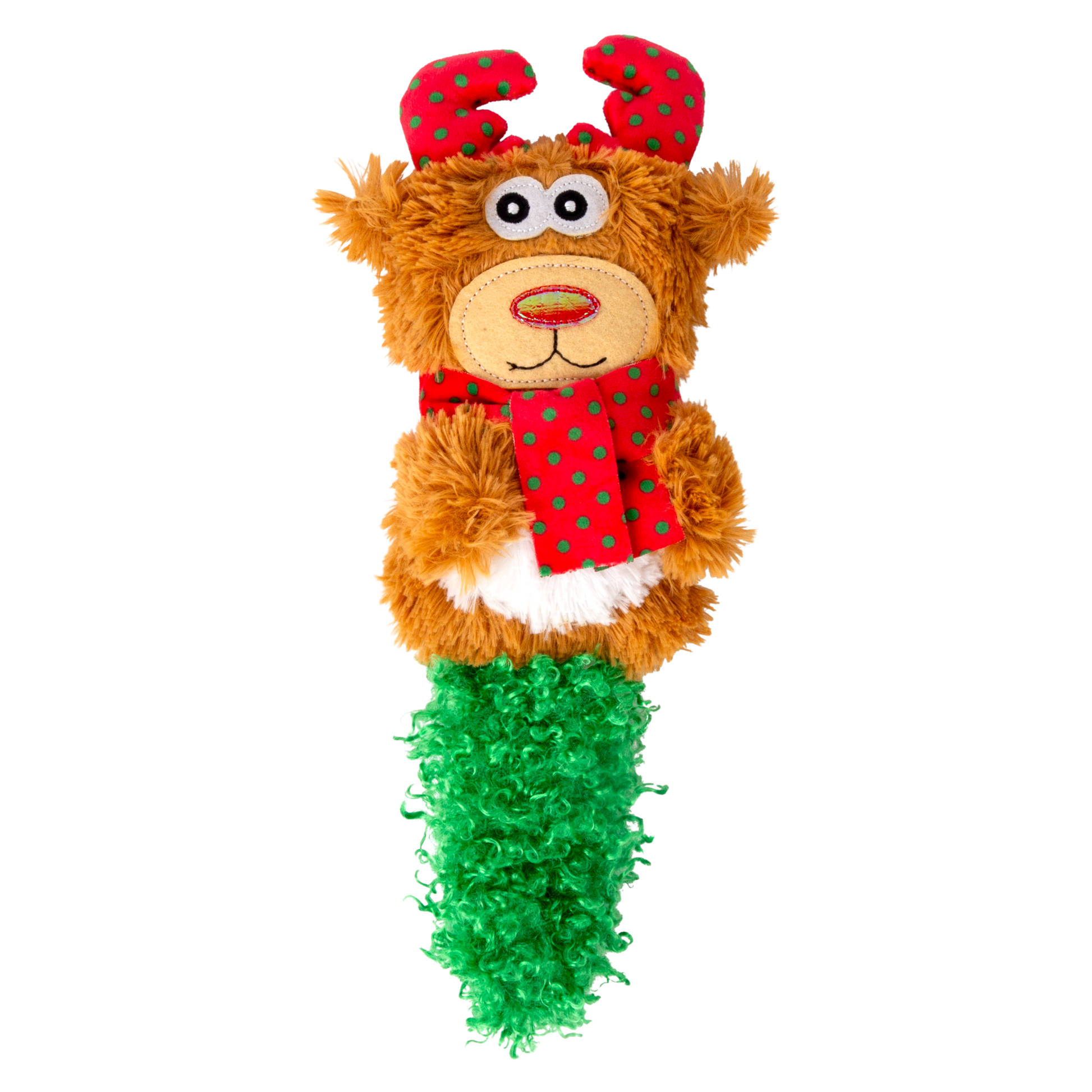 Long shape promotes full-body wrestling and hind paw kicking . Crinkle sound adds excitement that keeps kitties playing . Soft and cuddly for snuggling . Adorable holiday characters’ soft plush is ideal for holiday snuggles and indoor cuddles when the weather outside is frightful .