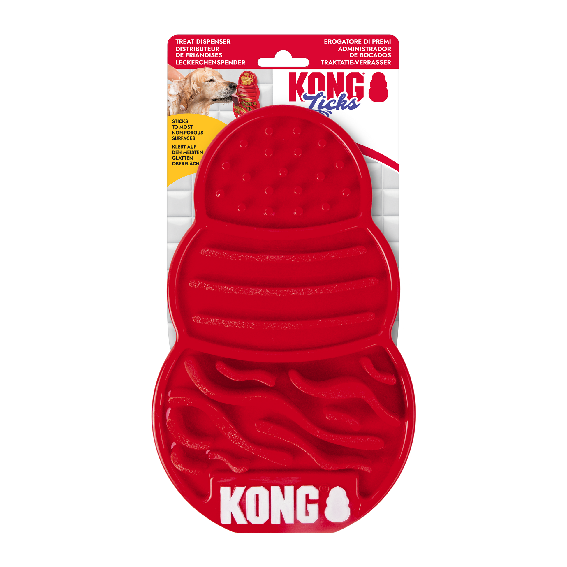 KONG Licks ridges and grooves hold Easy Treat, peanut butter, kibble, etc., for long-lasting licking. Fights boredom and occupies distraction during exams, baths and nail trims. Plus, licking releases endorphins that help soothe dogs. Two suction cups stick to flat surfaces for a movable feast of fun. Different ridge shapes hold variety of food, keeps pups interested and helps clean tongue and teeth.