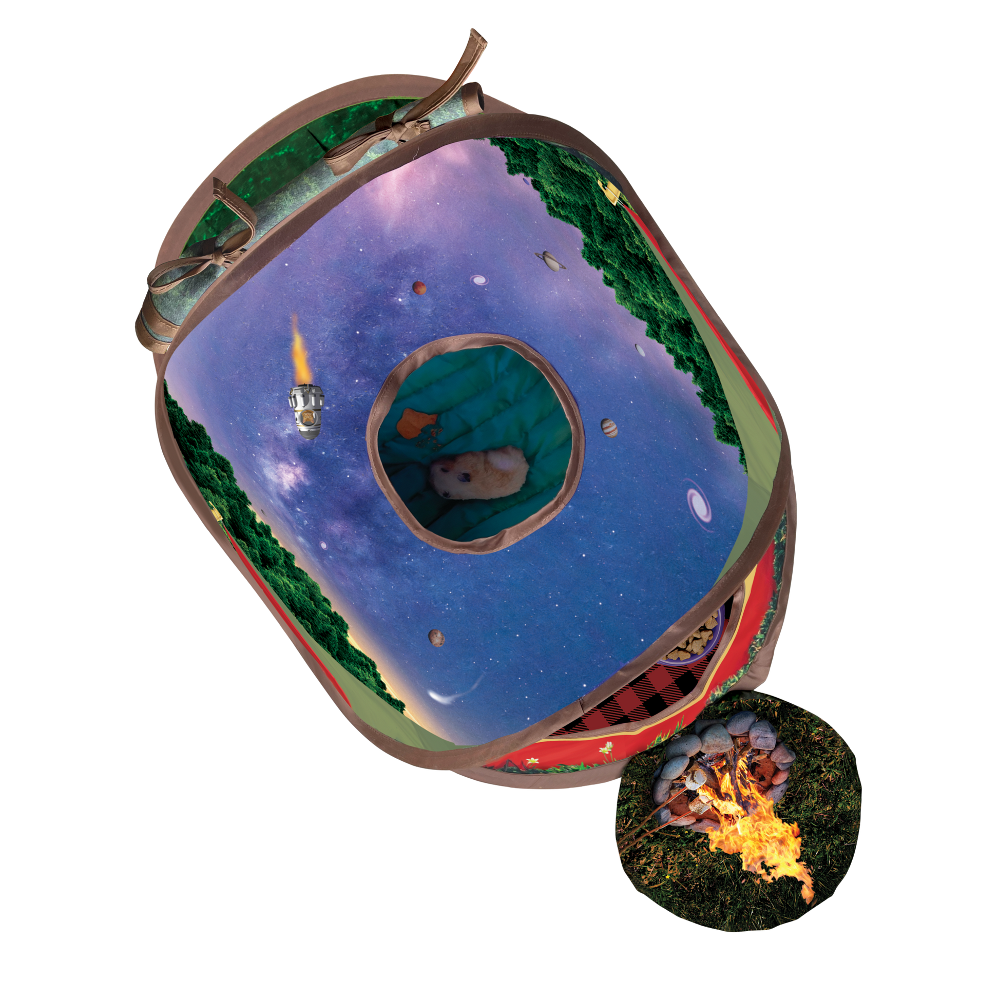 Cozy outdoor “glamping†scene for hiding, napping, and play sessions . Peek-a-boo openings for hide & seek fun . Attached dangling and crinkle toys with catnip to entice energetic play . Entrance flap rolls up to stay open . Folds down for easy, compact storage