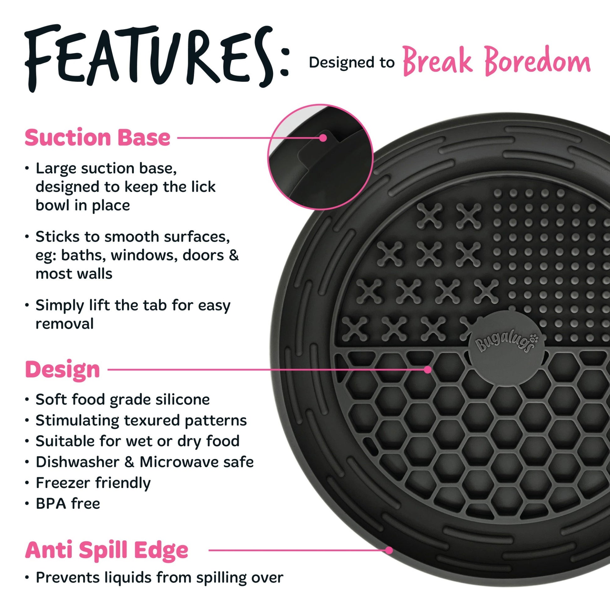 Buglaugs Lick Bowl Slow Feeder is a great boredom breaker for keeping your pet entertained & distracted whilst reducing stress & anxiety. Strong suction cups stick firmly to smooth surfaces including floors, walls & tiles. Ideal for anxiety, grooming, training, bath time & fireworks. Suitable for all dogs and cats.