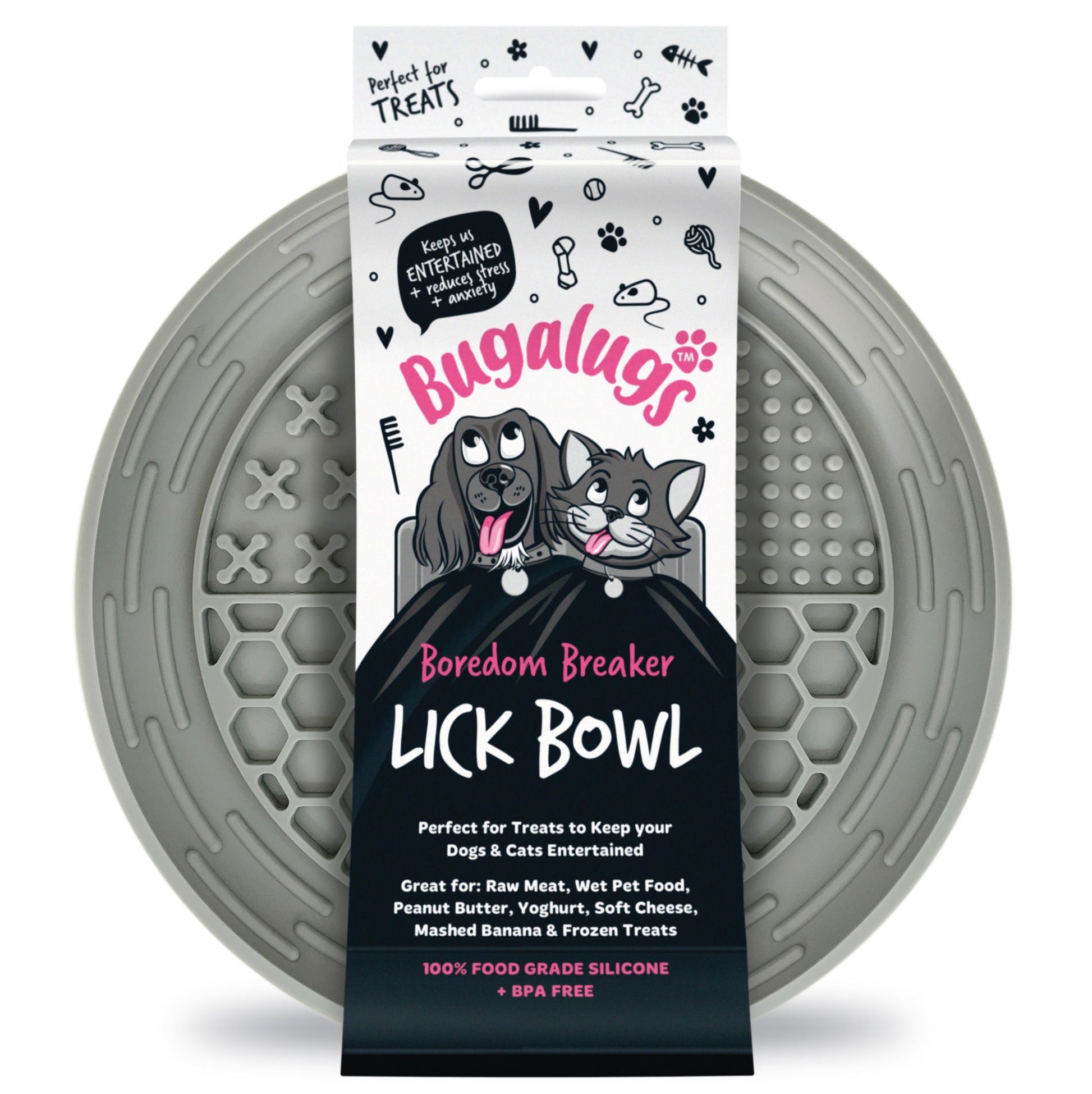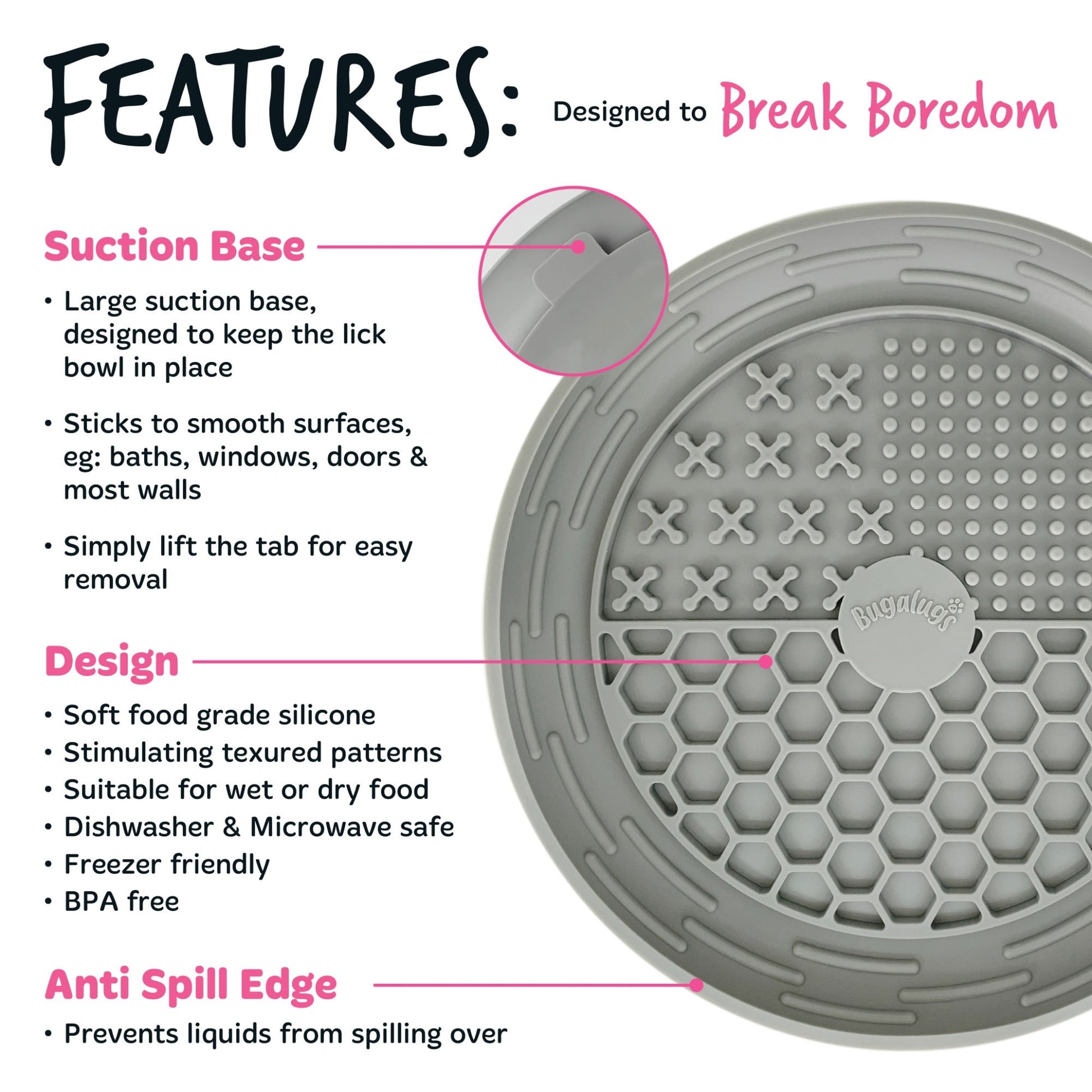 Buglaugs Lick Bowl Slow Feeder is a great boredom breaker for keeping your pet entertained & distracted whilst reducing stress & anxiety. Strong suction cups stick firmly to smooth surfaces including floors, walls & tiles. Ideal for anxiety, grooming, training, bath time & fireworks. Suitable for all dogs and cats.