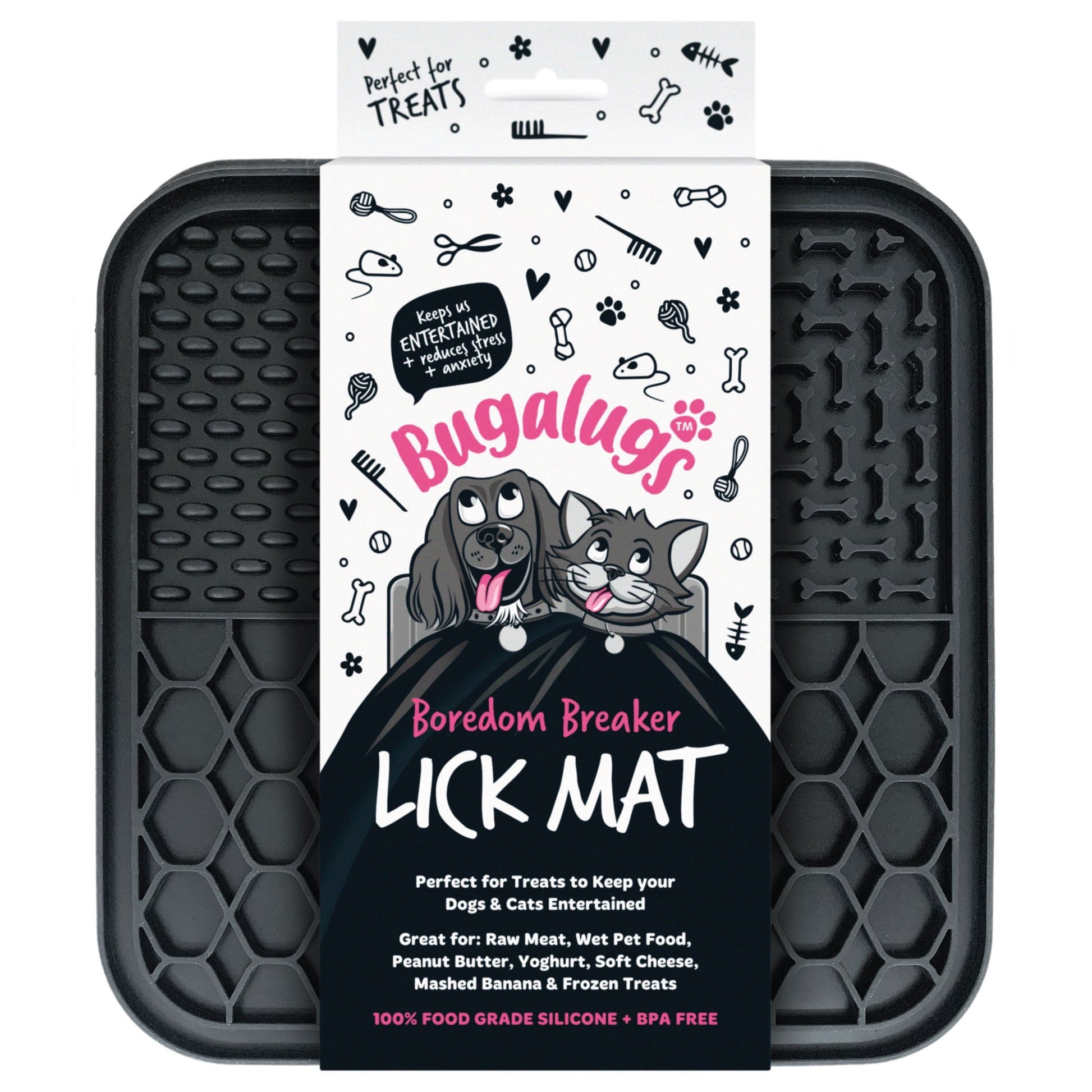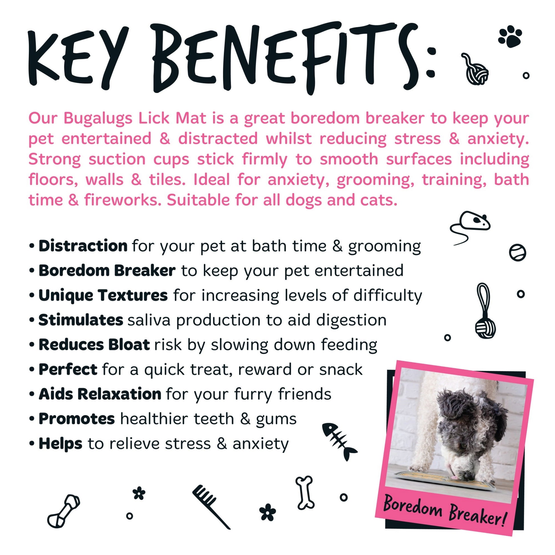 Buglaugs Lick Mat Slow Feeder is a great boredom breaker for keeping your pet entertained & distracted whilst reducing stress & anxiety. Strong suction cups stick firmly to smooth surfaces including floors, walls & tiles. Ideal for anxiety, grooming, training, bath time & fireworks. Suitable for all dogs and cats.