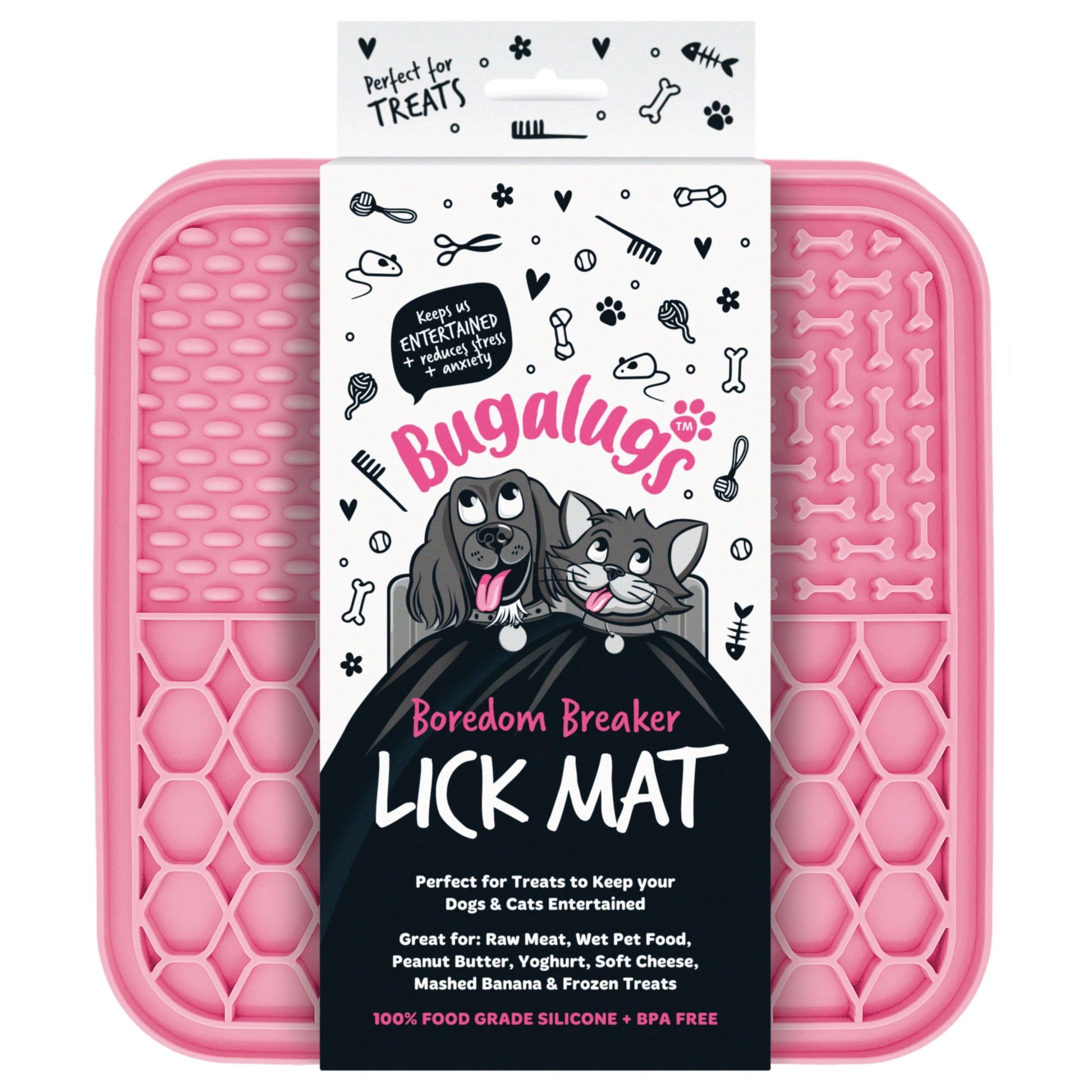 Buglaugs Lick Mat Slow Feeder is a great boredom breaker for keeping your pet entertained & distracted whilst reducing stress & anxiety. Strong suction cups stick firmly to smooth surfaces including floors, walls & tiles. Ideal for anxiety, grooming, training, bath time & fireworks. Suitable for all dogs and cats.