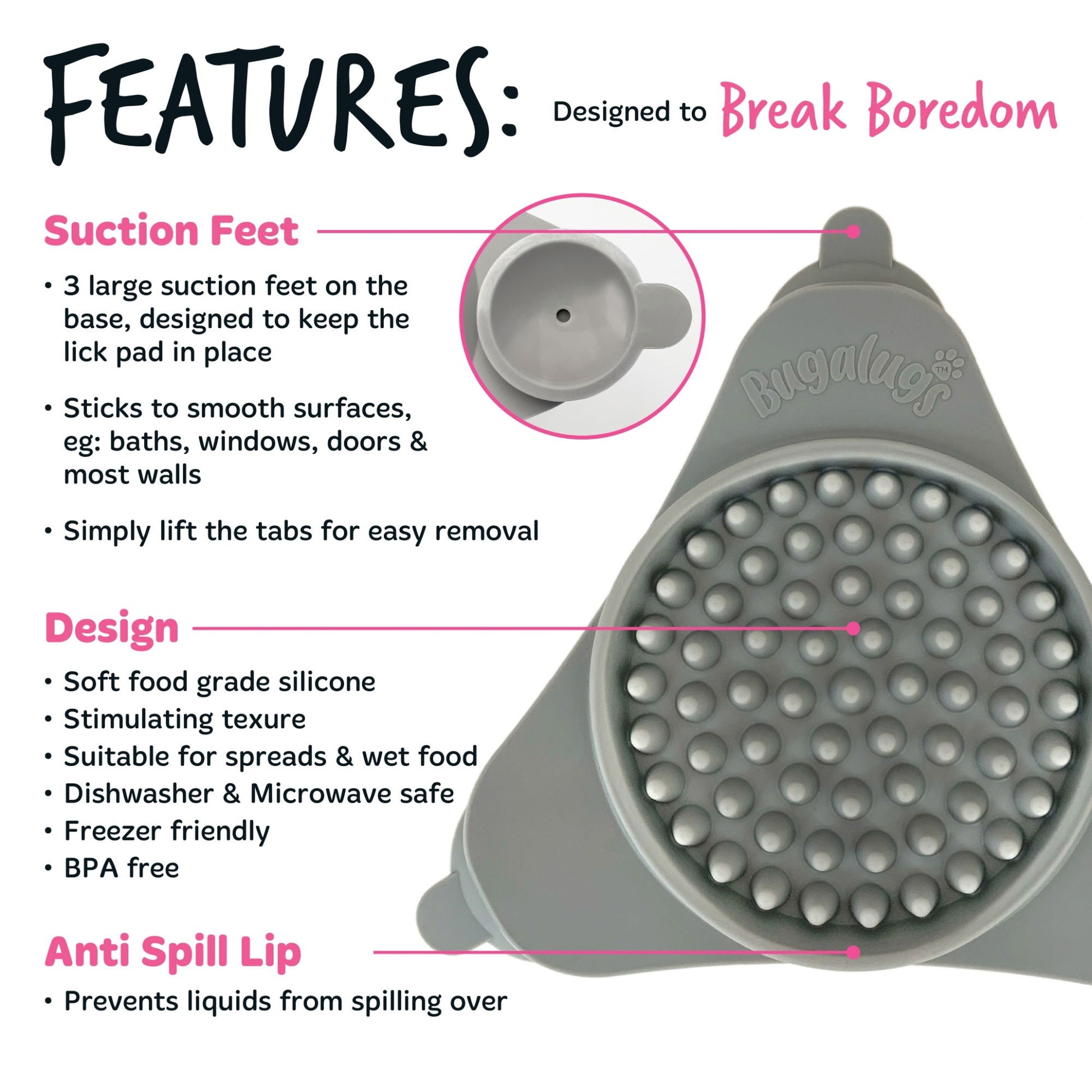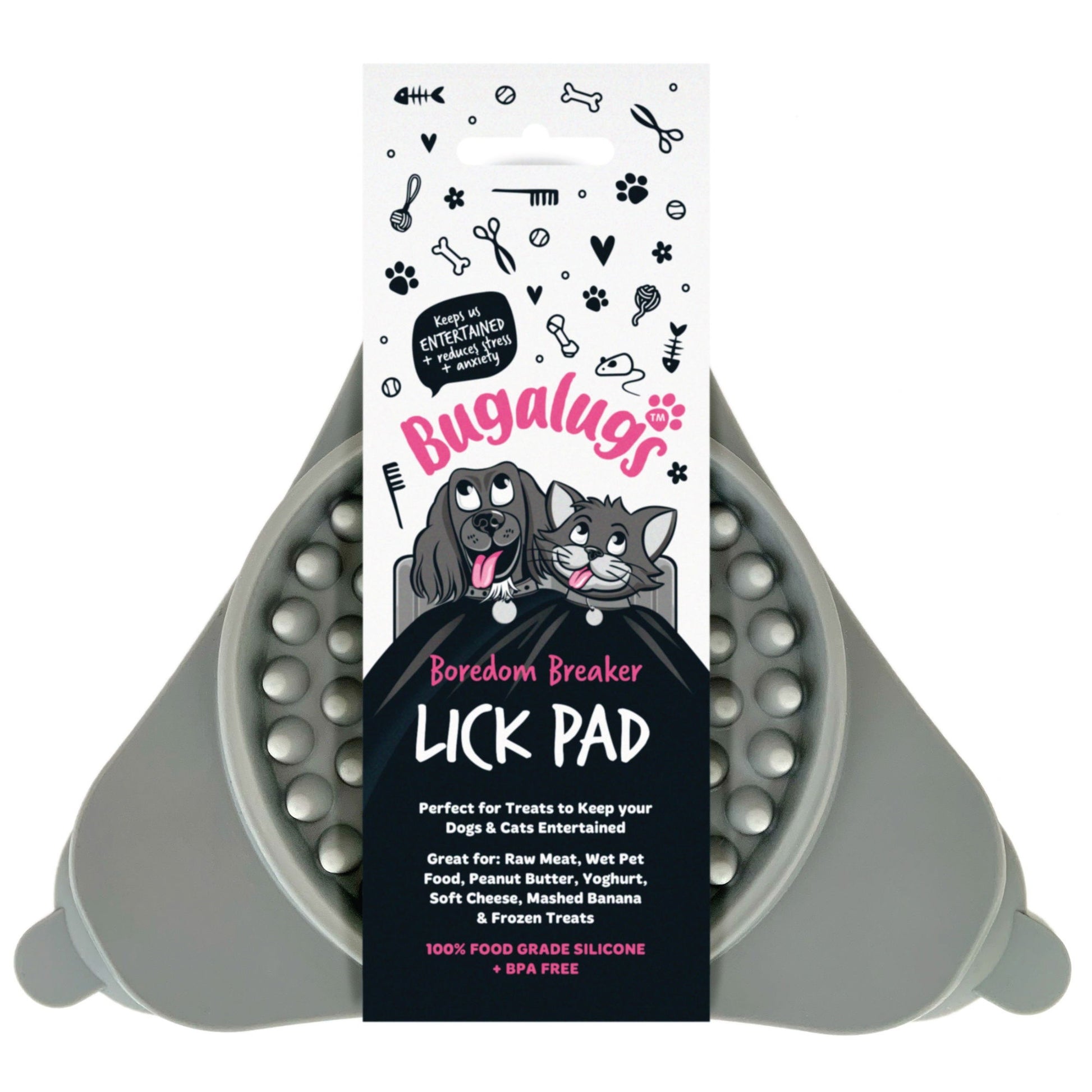 Buglaugs Lick Pad Slow Feeder is a great boredom breaker for keeping your pet entertained & distracted whilst reducing stress & anxiety. Strong suction cups stick firmly to smooth surfaces including floors, walls & tiles. Ideal for anxiety, grooming, training, bath time & fireworks. Suitable for all dogs and cats.
