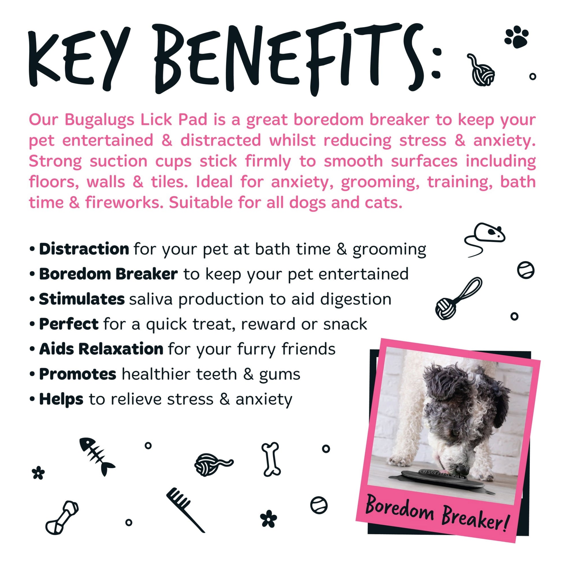 ? Boredom breaker to keep your pet entertained ? Makes bath time & grooming easier for you and your pet ? Stimulates saliva production to aid digestion ? Promotes healthier teeth & gums ? Reduces bloat risk by slowing down feeding ? Perfect for a quick treat, reward or snack ? Helps to relieve stress & anxiety ? Aids relaxation for your furry friends ? Unique textures for increasing levels of difficulty