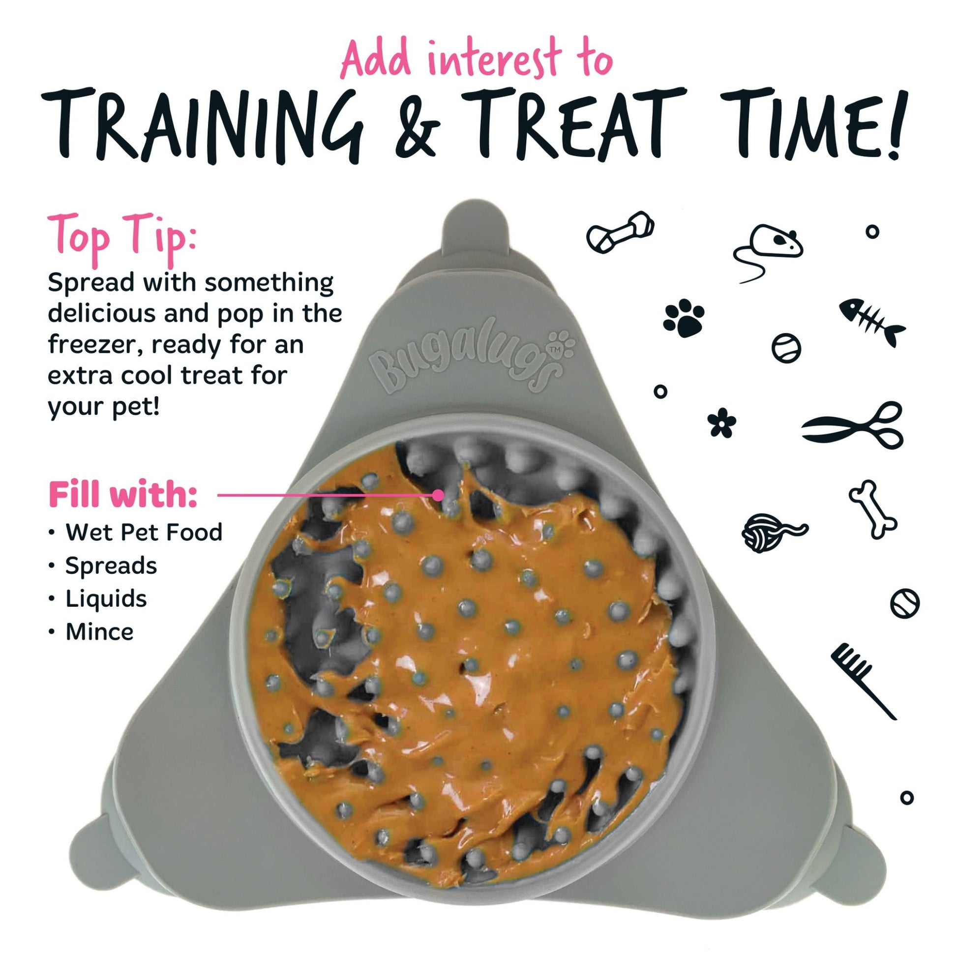 Wash before and after every use. Spread food or treats into surface, fix firmly to floor, or stick to wall. Freezer friendly, dishwasher & microwave safe. Use alongside Bugalugs treats and supplements these include Peanut Butter, Salmon Oil, Seaweed Plaque Remover, Pumpkin Powder, Hemp Oil, Antler Powder, Himalayan Cheese Topper & Many More.