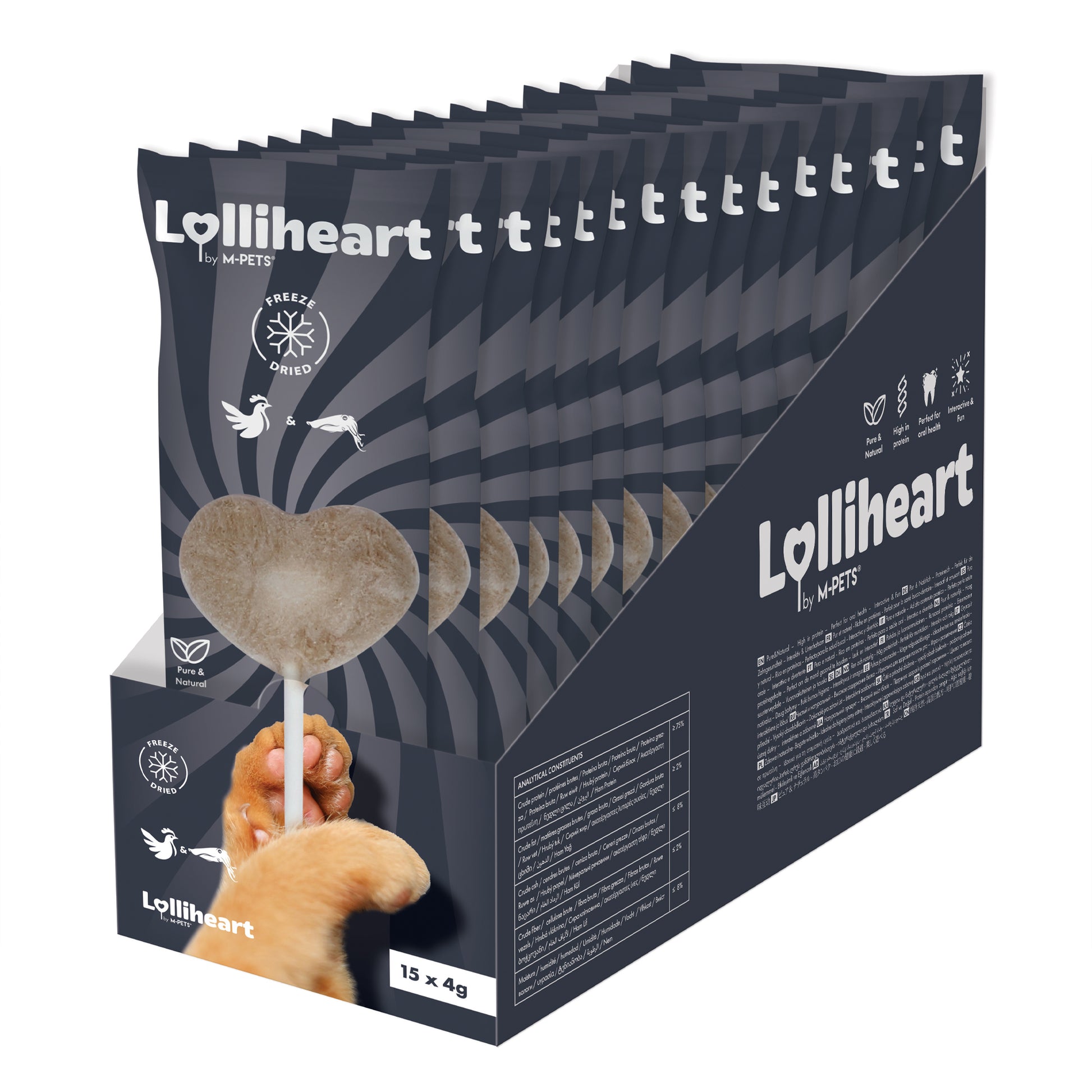 4g x 15pcs • Rich in protein, low in fat • Freeze-dried to lock in nutrients • Supports dental health • Irresistibly fun for interactive play A delicious and wholesome treat that’s freeze-dried to preserve its natural goodness. Each heart-shaped bite is packed with protein, promotes oral health, and adds a moment of joyful bonding to your cat’s day. Ideal for training, rewarding, or simply showing your love. Chicken99%, Cuttle Fish1% Crude protein = 75% Crude fat = 2% Crude ash = 8% Crude fiber = 2% Moisture = 8%