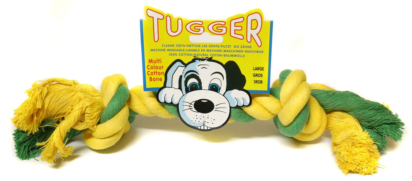 Tuggers Pure cotton dog toys made in both multicolour and white, including 2 and 3 knot variants. A further and innovative range includes the largest 2 knot Mega Bone.