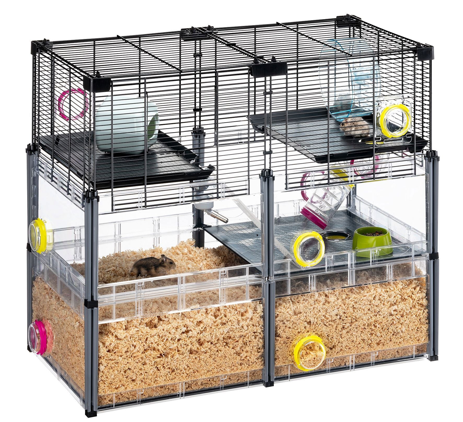 The Multipla Hamster Crystal model, thanks to the living area of 0,52 square meters on several floors, is perfect for hosting even more specimens of hamsters or mice together in complete tranquillity. The cage is equipped with a house, bowl, drinking bottle, wheel, ladder to access the different floors and tubes for rodents. The design, patented by Ferplast, is essential and functional: the transparent plastic walls allow a complete view of the pet inside. The tall base is roomy and can be filled with sawdust in which hamsters and mice love to dig and hide.