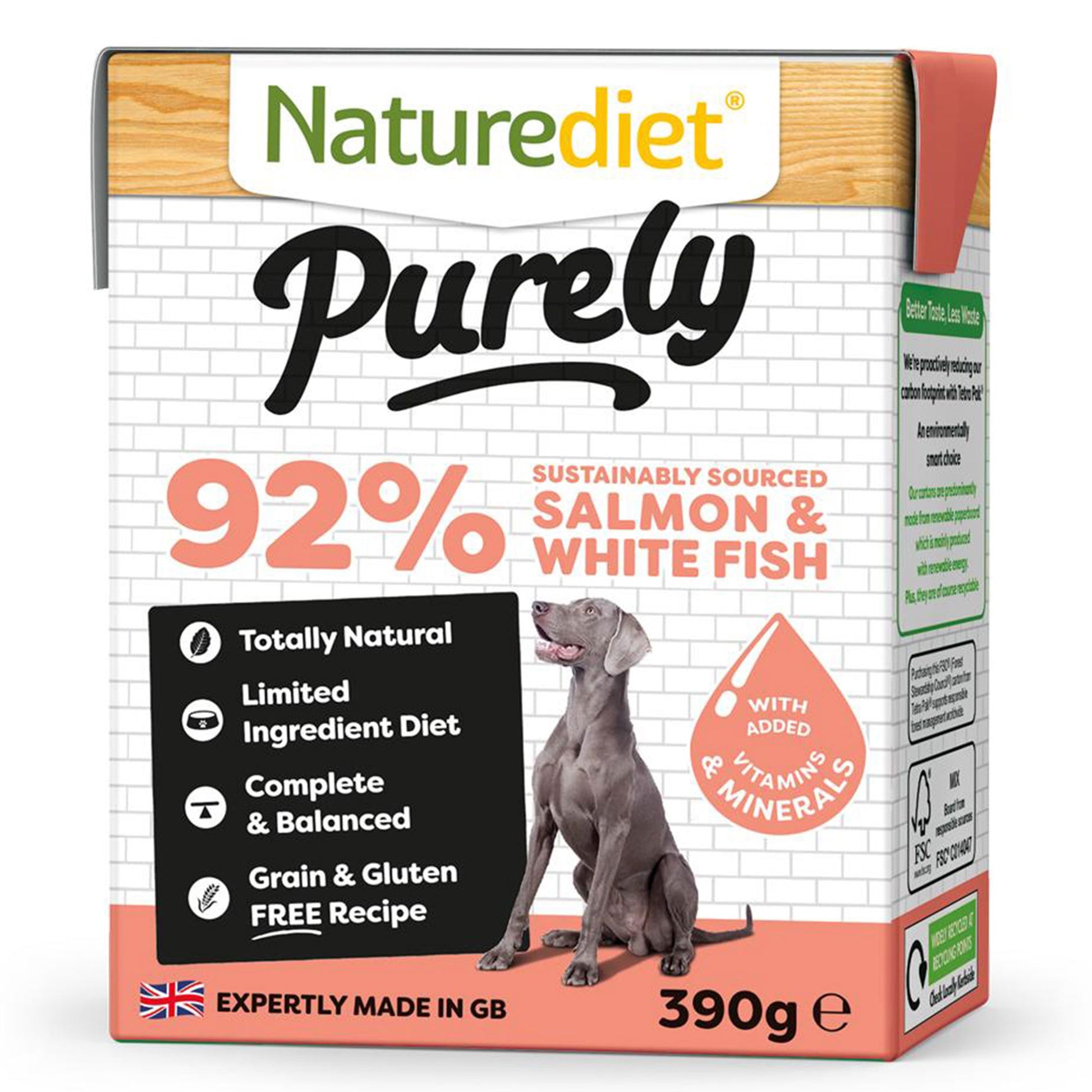 Less is more! Purely is a specially developed range of grain free, just meat or fish wet food recipes that cut out problem ingredients associated with sensitive digestion and dietary intolerances. Limited in ingredients but without compromising on taste, Purely is packed with a 92% meat or fish content, carefully selected vitamins and minerals, blended with a splash of water and gently steam cooked to retain flavour and nutrients. Simply serve alone or with a high quality mixer. Salmon 64%, White Fish 28%. Crude Protein 12%, Crude Fat 10.5%, Crude Fibre 2%, Crude Ash 3%, Moisture 68%. Vitamin A 3,000IU Vitamin D3 250IU, Iron (as Iron (II) Sulphate Monohydrate) 12mg, Copper (as Copper (II) Sulphate Pentahydrate) 1.2mg, Manganese (as Manganous Sulphate Monohydrate) 2mg, Zinc (as Zinc Sulphate Monohydrate) 25mg.