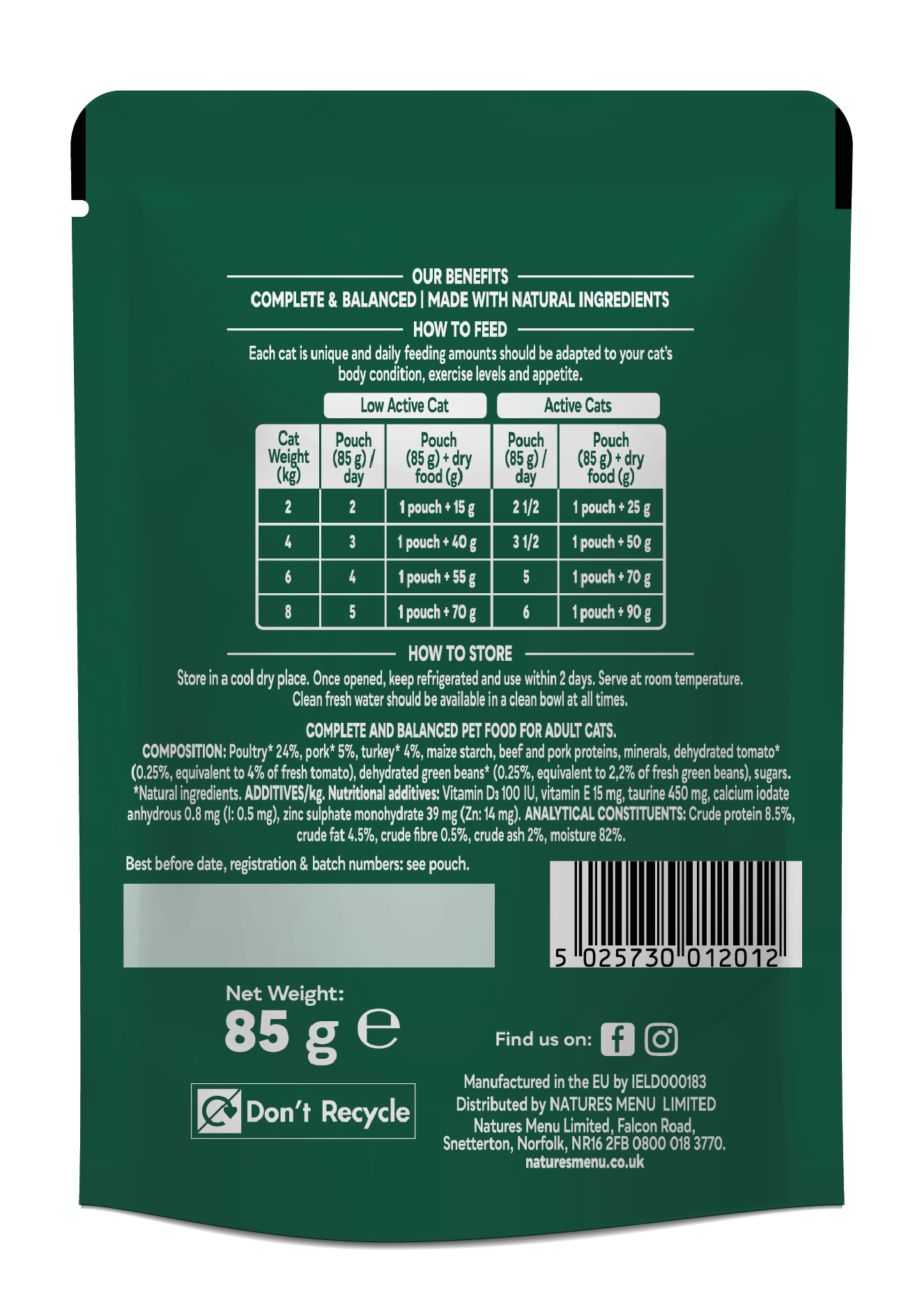 COMPOSITION: Poultry* 24%, pork* 5%, turkey* 4%, maize starch, beef and pork proteins, minerals, dehydrated tomato* (0.25%, equivalent to 4% of fresh tomato), dehydrated green beans* (0.25%, equivalent to 2,2% of fresh green beans), sugars. *Natural ingredients.