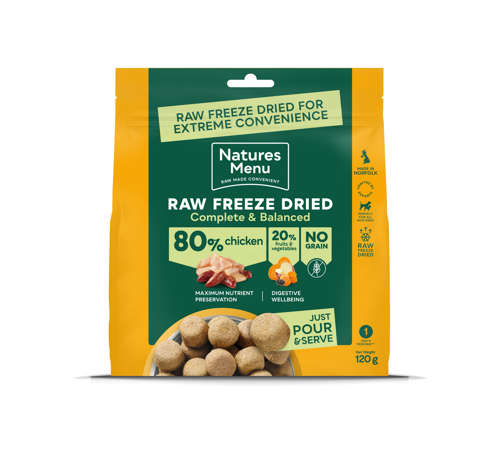Delicious complete and balanced chicken for dogs Freeze Dried food, made with 80% quality chicken blended with wholesome superfoods to help support digestive wellbeing.