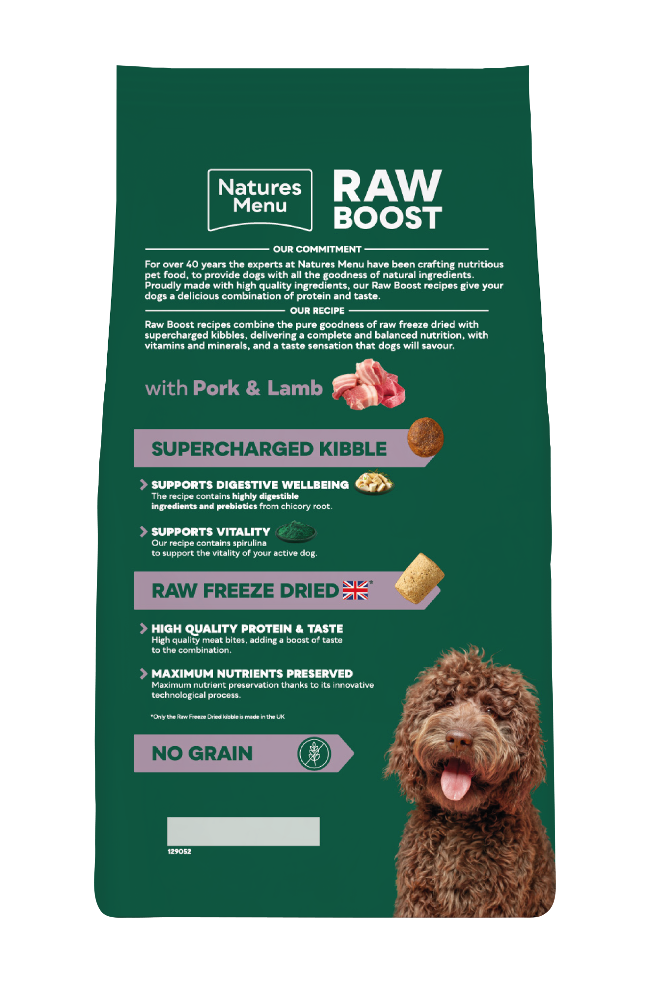 Raw Boost recipes combine the pure goodness of raw freeze dried with supercharged kibbles, delivering a complete and balanced nutrition, with vitamins and minerals, and a taste sensation that dogs will savour.