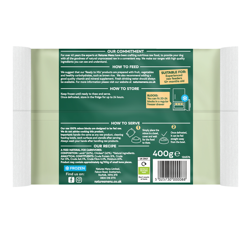 Minced Lamb And Chicken Dinner Convenient Pre-Packed Minced Meat For Use As Part Of A Natural Feeding Regime. Carefully Prepared From Whole Cuts Of Meat Including A Natural Bone Content. Small Case Sizes Allow You To Stock A Wider Range Of Varieties.