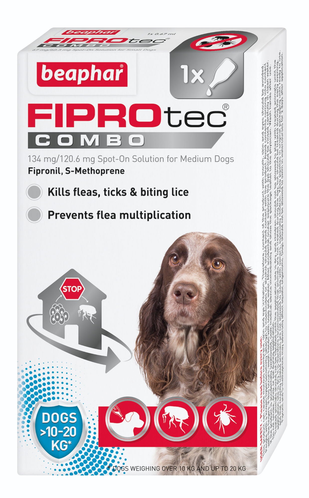 Beaphar FIPROtec COMBO for Medium Dogs is a veterinary strength medicine providing complete flea and tick control for busy families. Combining the well-known active ingredient fipronil and the insect growth regulator S-methoprene, the Beaphar FIPROtec COMBO range provides double action flea control to protect your pet and your home. Beaphar FIPROtec COMBO for Medium Dogs kills adult fleas for up to eight weeks, ticks for up to four weeks, protects your home against developing flea eggs and flea larvae for eight weeks and also kills biting lice. Suitable for dogs from 8 weeks of age and weighing 10-20kg. Suitable for pregnant and lactating bitches. All pets are at risks from fleas, even dogs that don't go outside very much, as we can bring them in on our clothes. It is important to establish a regular flea control routine for your pets and your home. For continued protection reapply Beaphar FIPROtec COMBO for Medium Dogs every four weeks.