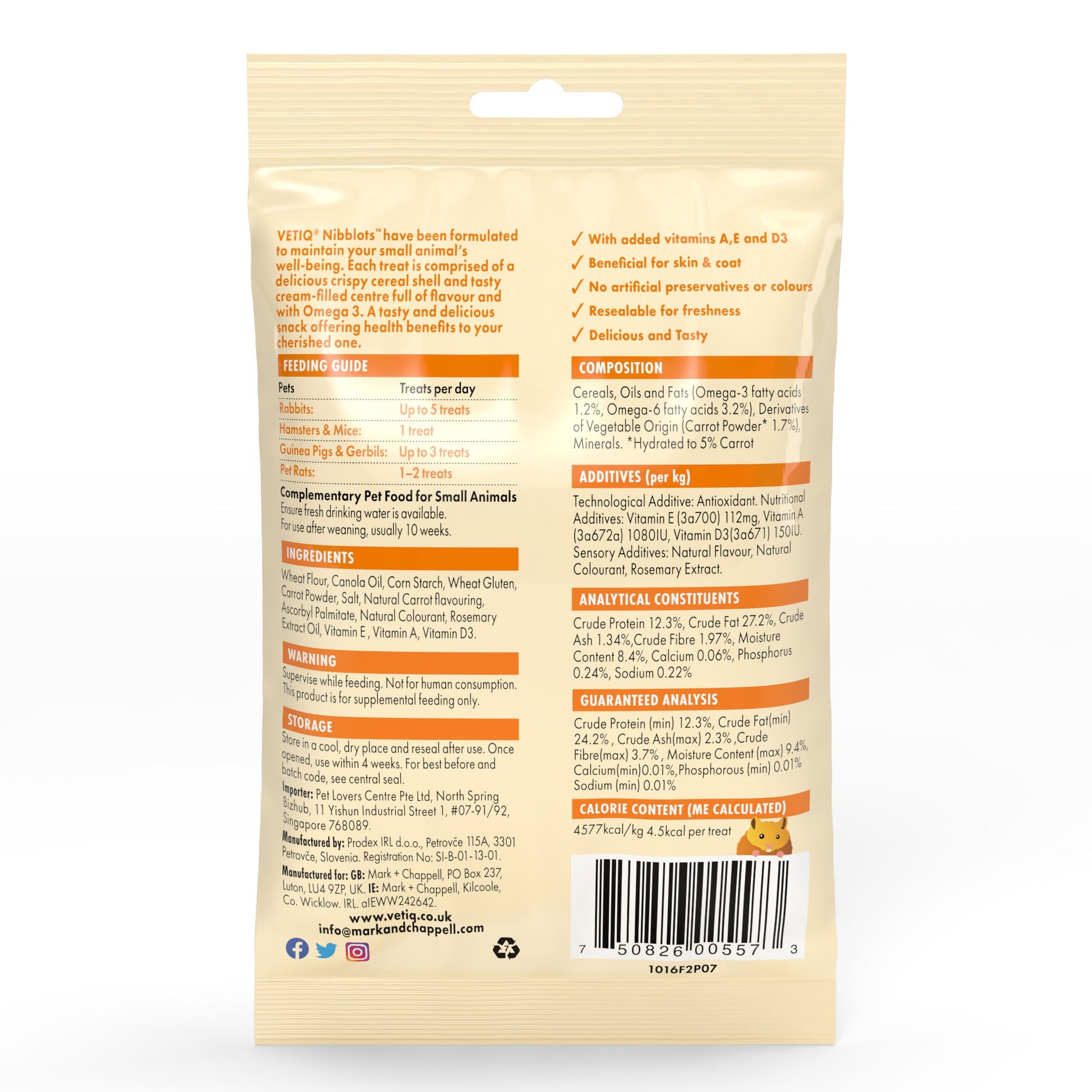 VETIQ ® Nibblots have been formulated to maintain your small animal’s well-being. Each treat is comprised of a delicious crispy cereal shell and tasty cream-filled centre full of flavour and with Omega 3. A tasty and delicious snack offering health benefits to your cherished one and they can help to promote bonding between pet and owner. Delicious & Tasty. With Added Vitamins A, E and D3. Beneficial For Skin & Coat. No Artificial Colours or Preservatives. Natural Preservative System (Rosemary Extract). Feeding guide : Complementary Pet Food for small animals. Hamsters & Mice: 1 treat per day. Pet Rats: 1-2 treats per day. Guinea Pigs & Gerbils: Up to 3 treats per day. Rabbits: Up to 5 treats per day. Ingredients: Wheat Flour, Canola Oil, Corn Starch, Wheat Gluten, Carrot Powder, Salt, Natural Carrot flavouring, Ascorbyl Palmitate, Natural Colourant, Rosemary Extract Oil, Vitamin E , Vitamin A, Vitamin D3.
