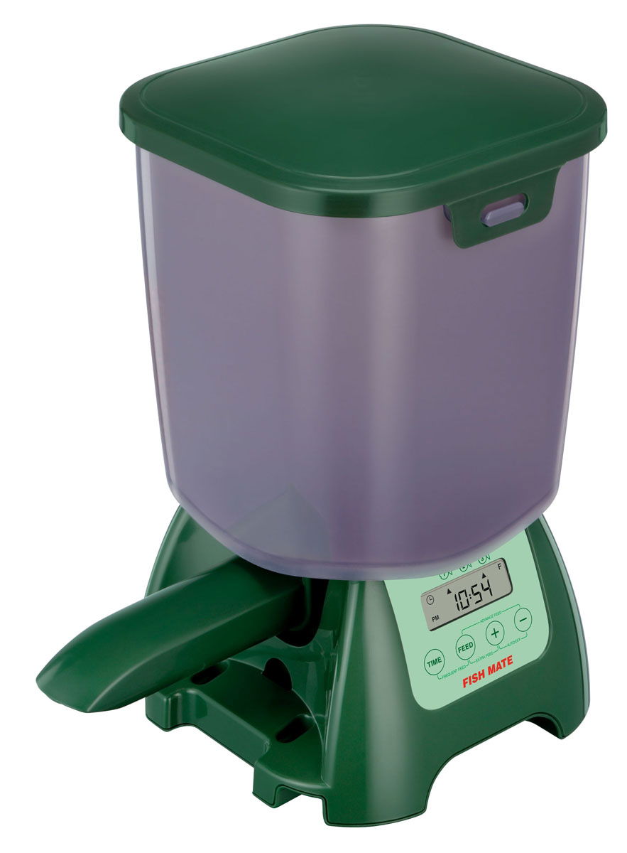 It is important to your fishes’ health that they are fed regular controlled portions in order to maximise growth and vitality, without the risks of overfeeding. The Fish Mate P7000 Pond Fish Feeder has been developed to allow variable feed sizes to be dispensed at times programmed by you or on demand at the touch of a button. Ideal for holiday feeding, the feeder’s green colour blends harmoniously into the garden environment.