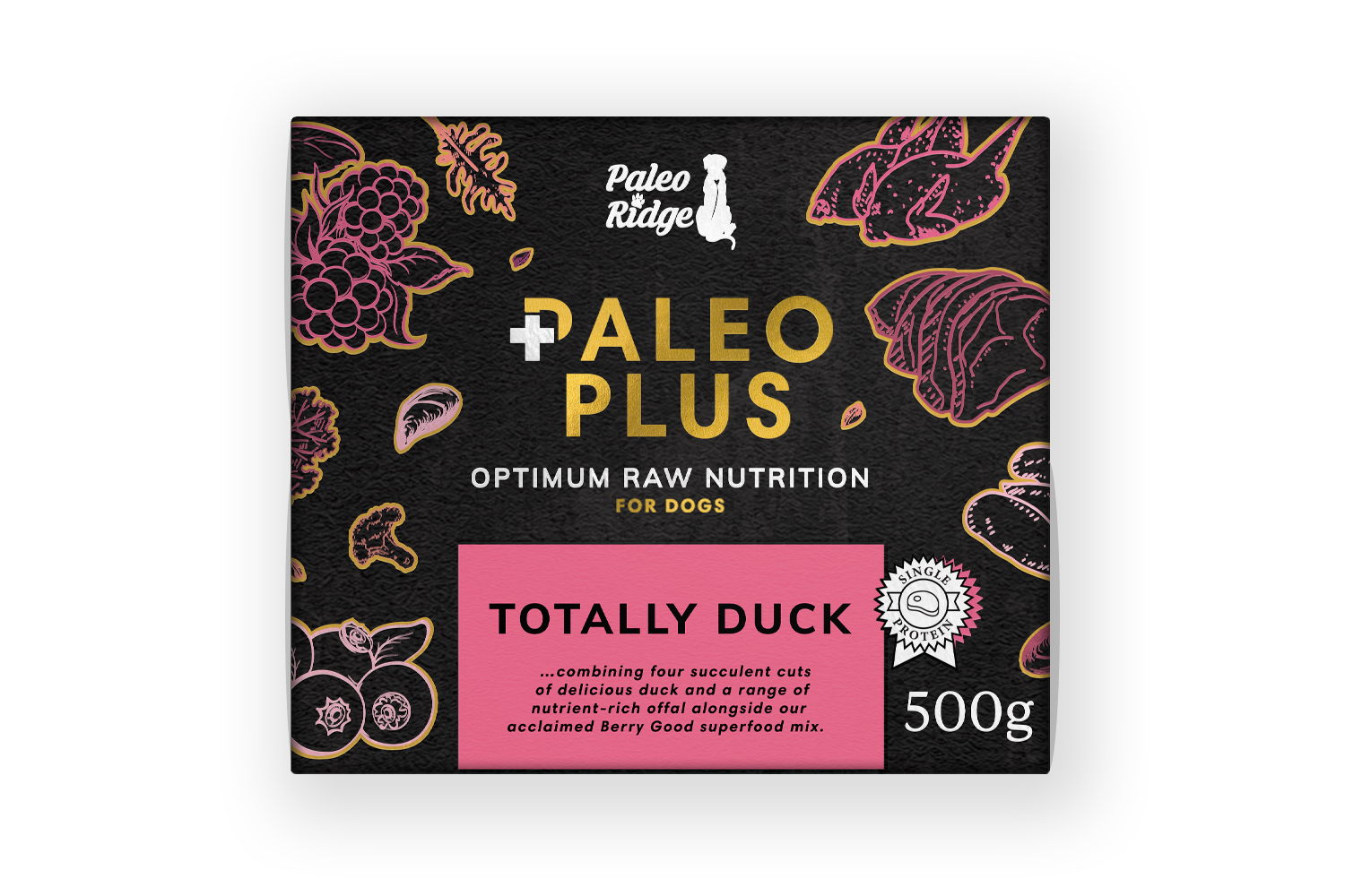 Paleo Plus Totally Duck has been carefully formulated, using the very latest scientific and nutritional research. Hand made with 95% High welfare, outdoor reared and grass-fed meat, offal and bone with a 5% unique blend of sustainably sourced natural superfoods. Paleo Plus offers exceptional canine nutrition to keep your dogs performing at their best. *Great for fussy dogs *Single protein meal *Great for sensitive tummies *Grain free *Hypoallergenic * Suitable for puppies *Suitable for seniors *Recyclable packaging *Healthy skin & coat *Oral hygiene *Reduced allergies *A strong healthy immune system