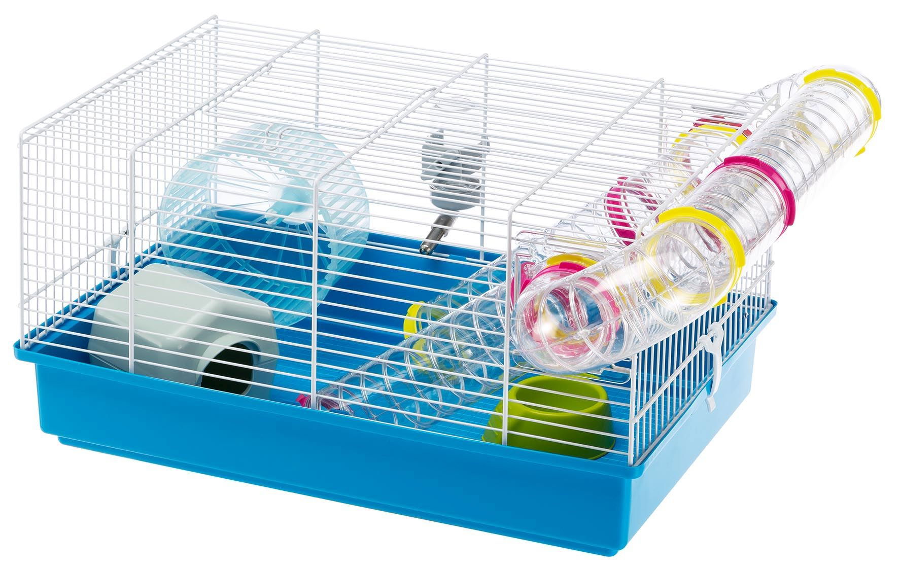 Paula is a traditional hamster cage with a plastic base and a painted wire mesh structure. It is equipped with accessories for rodents, including a nest, a feeder, a drinking bottle and a plastic wheel as well as transparent tubes, inside which your little rodent can run and have fun. Paula comes in an attractive colour combination: orange, blue and light grey.