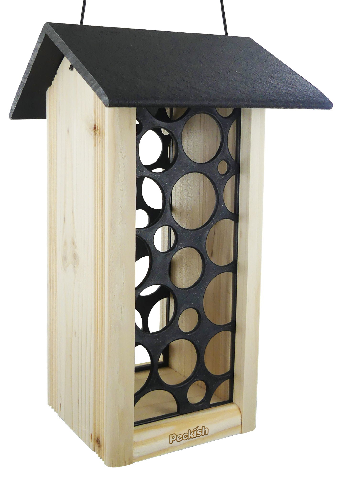 Peckish wooden feeder range to feed high energy fat balls. Manufactured from 100% sustainably sourced wood and the slate effect roof and suet mesh holder are made from 100% recyclabe materials.