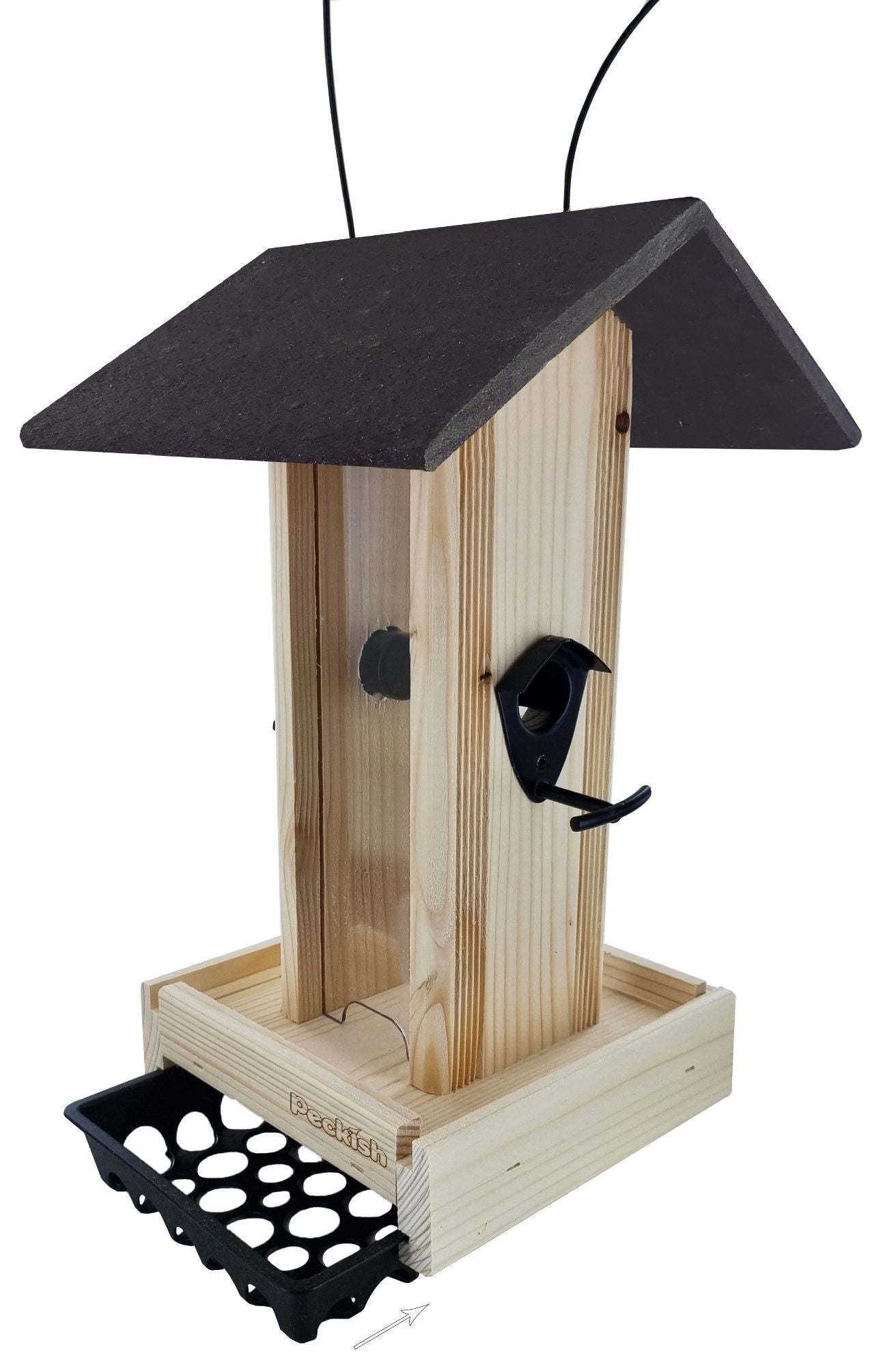 Peckish wooden feeder range to feed both seed and suet cakes. Manufactured from 100% sustainably sourced wood and the slate effect roof and suet cake mesh holder are made from 100% recyclabe materials.
