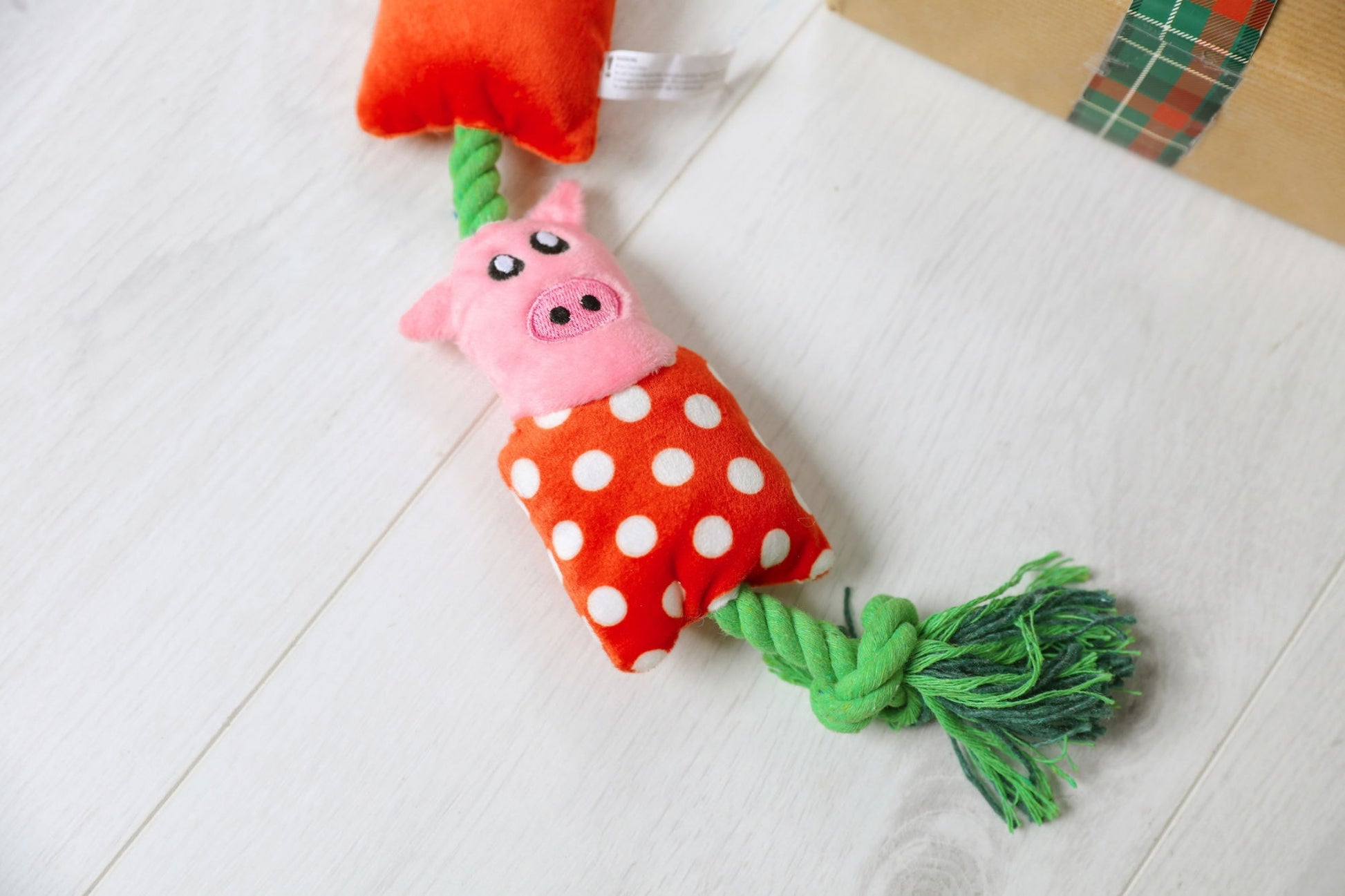 Pigs in Blankets Rope Toy for Dogs A fun and festive treat for your dog, this Christmas rope toy is sure to provide your four-legged friend with hours of entertainment. Made from durable green rope with three individual plush pigs wrapped in a blanket, each one featuring an internal squeaker to grab your dog’s attention and encourage further play. Suitable for most breeds and sizes to enjoy, this cute rope toy is ideal for dogs who love to chew as they play. The strong rope is knotted at each end, fantastic for a game of tug-of-war!