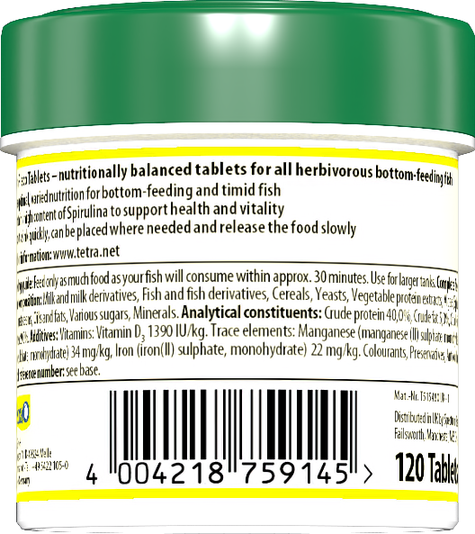 The optimal, varied nutrition for herbivorous bottom-feeding and timid fish Contains high content of Spirulina to support health and vitality Tablets sink quickly, can be placed where needed and release the food slowly Milk and milk derivatives, Fish and fish derivatives, Cereals, Yeasts, Vegetable protein extracts, Algae (Spirulina 5%), Molluscs and crustaceans, Oils and fats, Various sugars, Minerals.