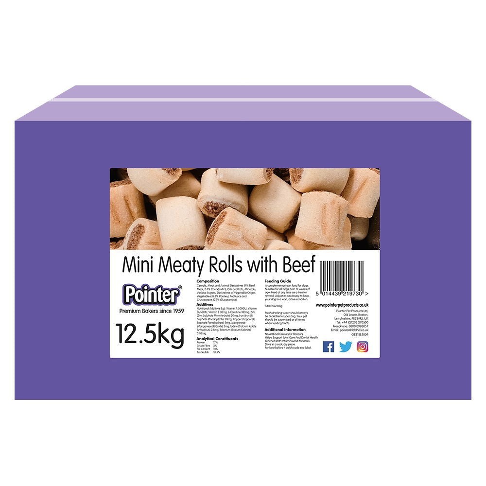 Pointer Mini Meaty Rolls are a crunchy biscuit treat, suitable for any breed of dog as a complementary food. These little biscuits make a delicious treat for your dog as a snack or reward for good behaviour. Enriched with essential vitamins and minerals. Their crunchy texture provides valuable exercise for teeth & gums. Composition: Cereals, Meat and Animal Derivatives (4% Meat Meal), Oils and Fats, Minerals, Various Sugars, Derivatives of Vegetable Origin. Additives: Colourants, Preservatives. Nutritional Additives (kg): Vitamin A 5000IU, Vitamin D3 500IU, Iron Sulphate Monohydrate 66.6mg, Zinc Sulphate Monohydrate 57mg, Copper Sulphate Pentahydrate 20mg, Manganese Oxide 4.83mg, Sodium Selenite 1.11mg, Calcium Iodate 0.79mg. Analyticals: Protein 16%, Crude Fibres 3%, Fat content 10%, Crude Ash 7%