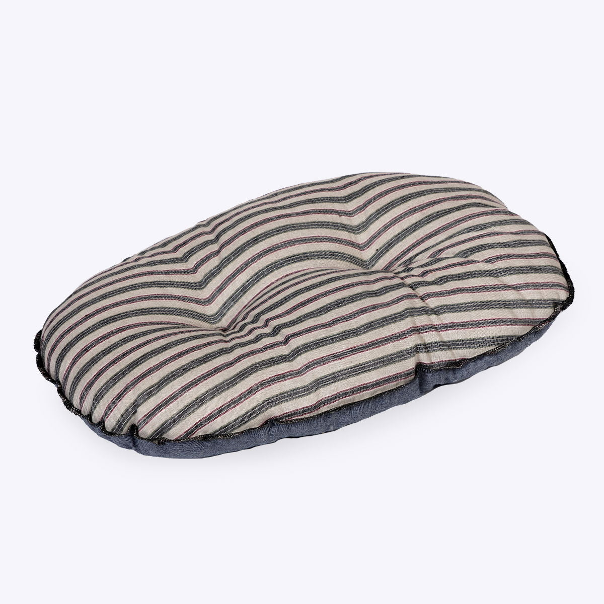 This collection of relaxed fabrics features woven ticking stripes and soft plains in calming colours. Crafted from a linen and cotton blend, these stripe fabrics offer a subtle textured finish for a rustic style. Available in two colourways; Denim – a soft and comfortable plain blue denim, paired with a hessian coloured ticking stripe, with highlights of subtle red and green. Grey – a muted grey plain, paired with a nautical inspired denim blue, off white and soft grey stripe. This oval quilted mattress is the perfect addition to wicker or plastic beds and is deep filled for extra warmth and comfort. Available in 4 sizes, there is bound to be the ideal fit. Alternatively, it can also be used as an independent bed for a quick snooze!