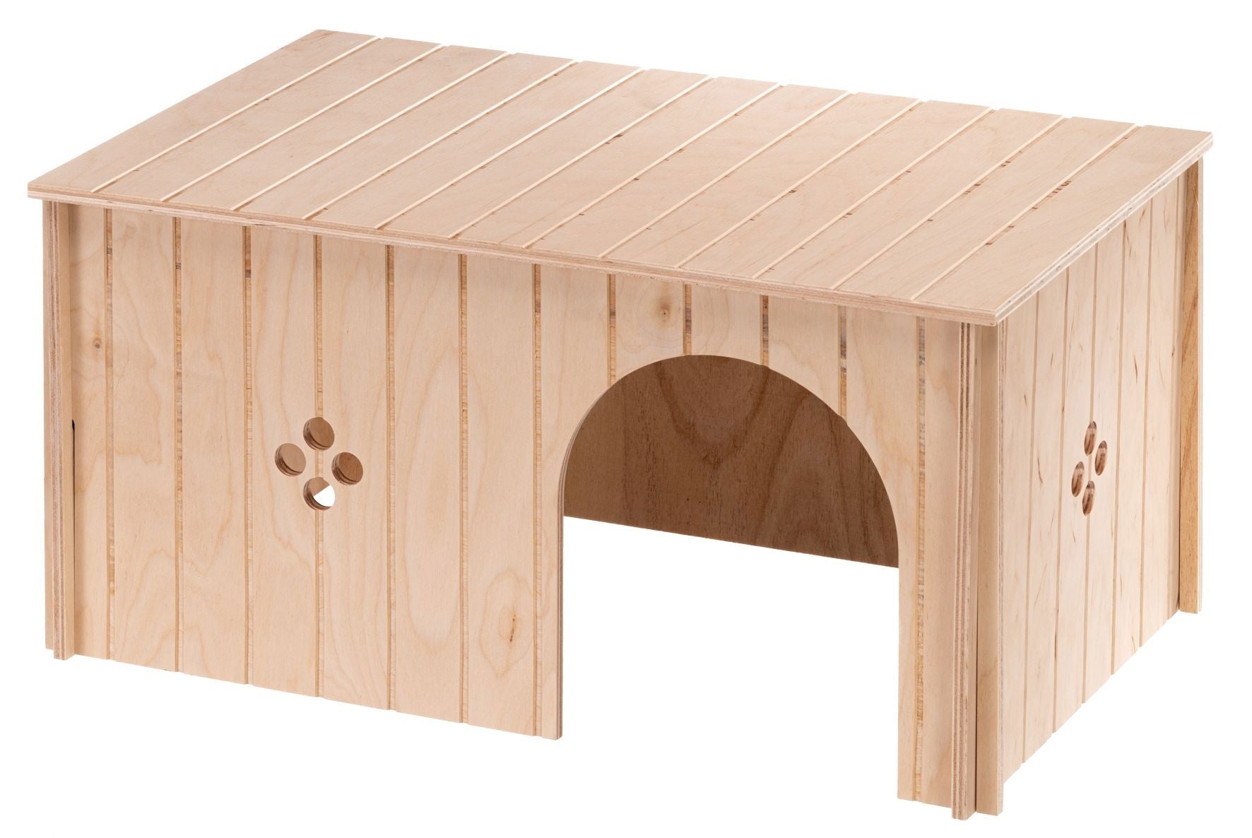 SIN Maxi is a roomy rabbit house made of wood, a cosy and comfortable home for your furry friend to hide in and feel safe. Part of the SIN line, this solid and sturdy house is environmentally friendly: it's made of FSCâ„¢ certified wood, that is sourced from forests that are managed correctly and responsibly according to strict environmental, social and economic standards and other controlled sources. The house has a flat roof and front entrance, and is made prettier by the decorative holes that also help air circulate inside. SIN Maxi is the perfect accessory for all Ferplast's rabbit cages: thanks to its generous size, it's ideal for extra-large rabbits.