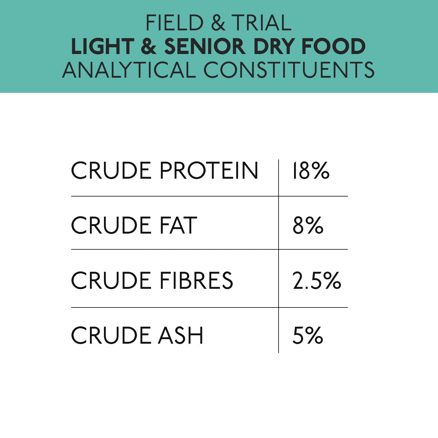 New Field & Trial Light & Senior is ideal for older, overweight or less active working dogs. It is wheat gluten free made with easily digestible chicken and contains enhanced levels of Glucosamine and Chondroitin to help protect the joints of your working.