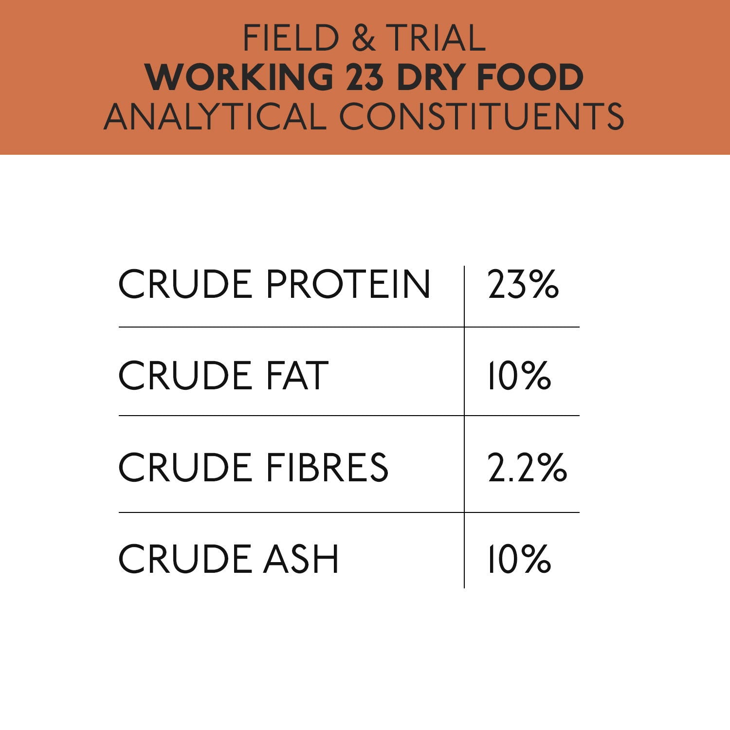 Field & Trial Working 23 is a complete working dog food. This dry food recipe has been specially developed and formulated to support dogs with a moderate to high activity level. With a protein level of 23% and a fat level of 10%, Working 23 supports the day-to-day energetic requirements for working and active dogs of all breeds and is a firm favourite with many working dog handlers. With a balance of digestible carbohydrates, Working 23 provides a diet to support those animals needing a nutritious fuel to support moderate to high activity levels such as working gundogs, agility dogs or active pets.