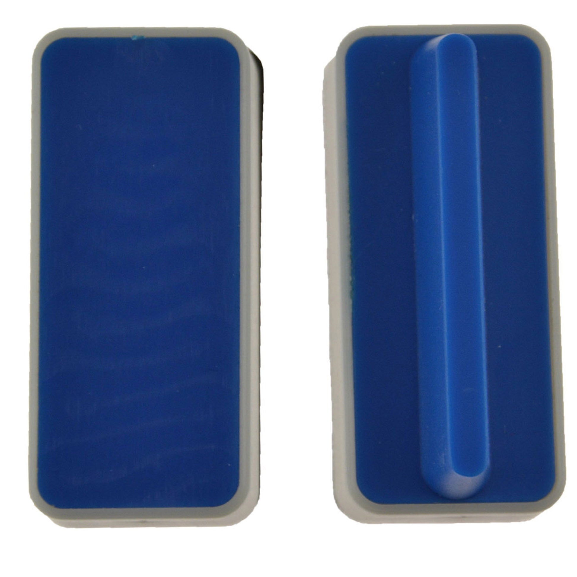The abrasive material on the inside magnet cleans the tank while the outside magnet which has a soft felt pad polishes the glass.