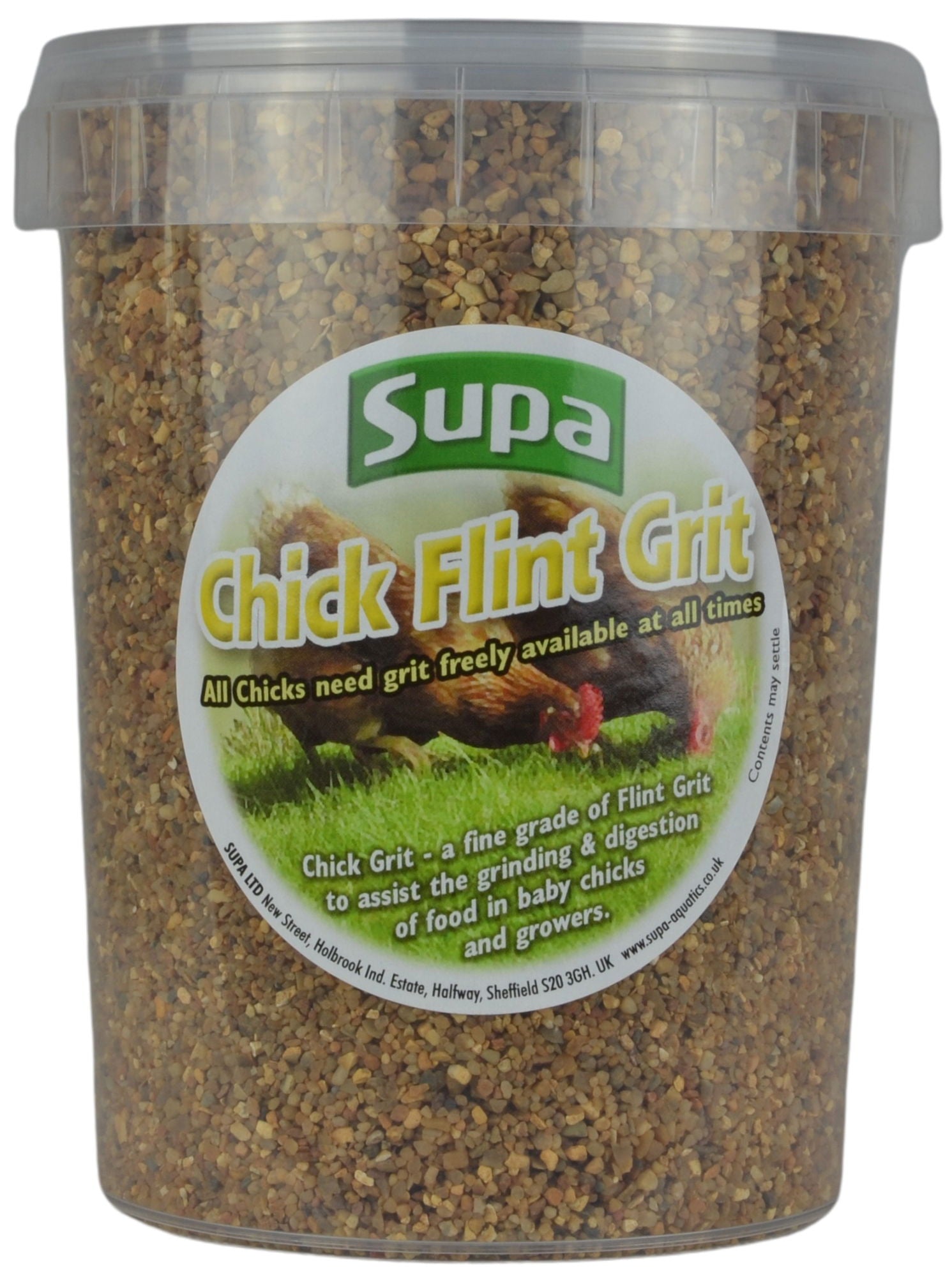 Chick Flint Grit ~ A Fine Grade Of Flint Grit To Assist The Grinding And Digestion Of Food In The Baby Chicks And Growers. Supa Chick Flint Grit Tub 1 litre is a fine grade of insoluble Flint Grit to assist the grinding and digestion of food. Chick Flint Grit is essential part of a bird’s diet as it aids the grinding up of food in the gizzard in effect acting as hens "teeth". Performs the grinding action necessary to make the food digestible. Ideal for Chicks and Growers birds. Comes in resealable tub which helps avoid contamination.