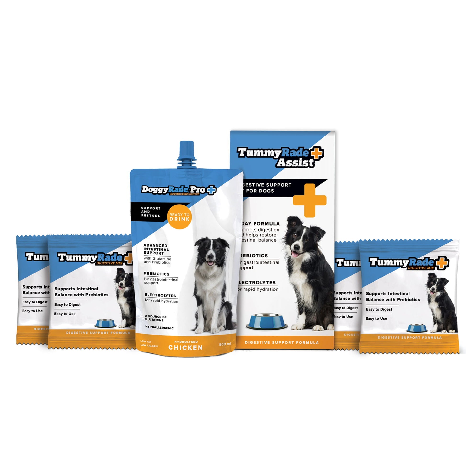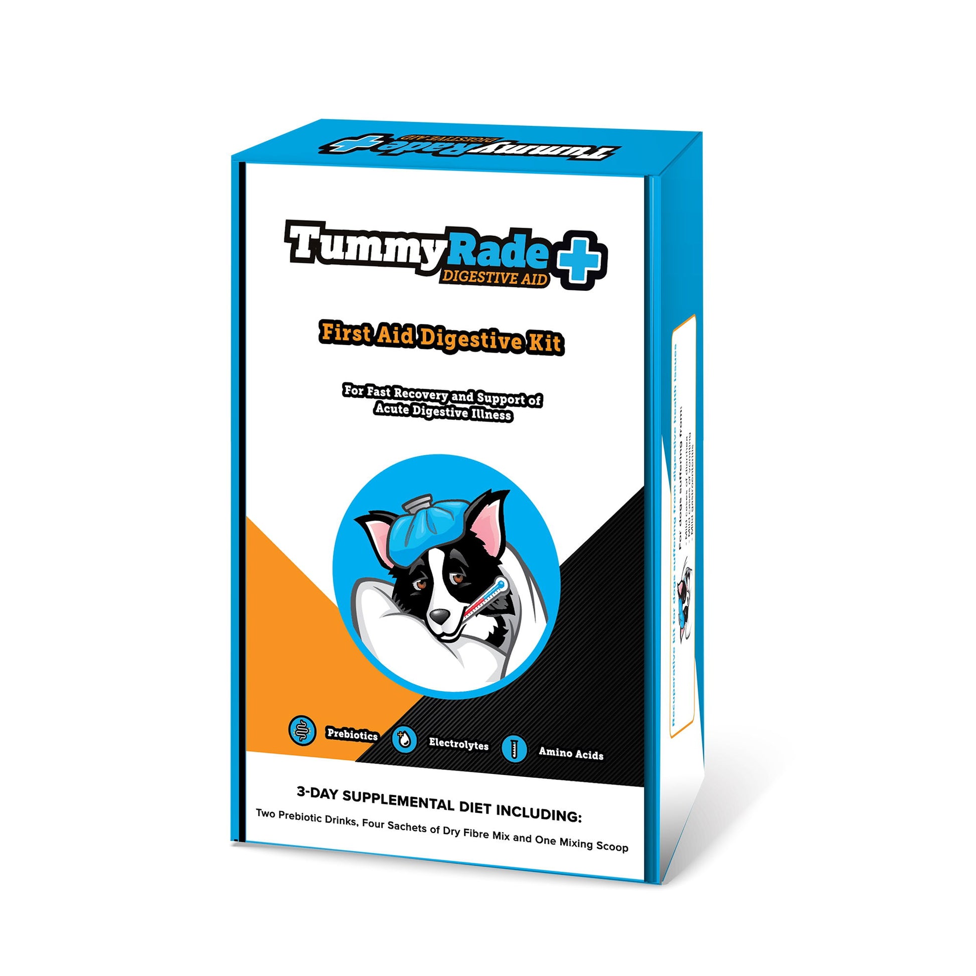TummyRade Pro is a digestive first aid kit for dogs. It is a simple remedy recipe formulated by veterinarians, to help dogs recover from upset tummies and mild cases of gastroenteritis, diarrhea or vomiting. This three-day supplemental diet, which contains a prebiotic drink and a specially formulated dry fibre mix, helps prepare the intestine for normal feed intake, allowing for a smoother transition back to its normal diet.