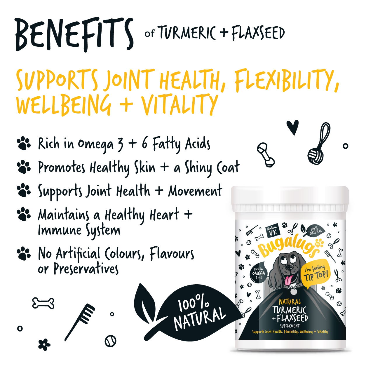 Bugalugs Natural Turmeric + Flaxseed Supplement is a premium blend formulated to support your dog’s joint health, flexibility, well-being, and vitality. This 100% natural supplement is rich in Omega-3 fatty acids from cold-pressed flaxseed oil and features the powerful antioxidant and anti-inflammatory properties of turmeric. Ideal for improving skin and coat health, it helps alleviate dry, itchy, and flaky skin while promoting a shiny, healthy coat. Flaxseed, known for its heart-healthy benefits, supports cardiovascular function, while turmeric aids in joint flexibility, making this a great addition to the diets of aging or senior dogs. Blended with black pepper to enhance turmeric’s bioavailability, this supplement boosts cognitive function and contributes to overall well-being. Free from artificial colours, flavours, and preservatives, it’s a perfect natural topper for any dog’s meal. Suitable for dogs from 4 months old.