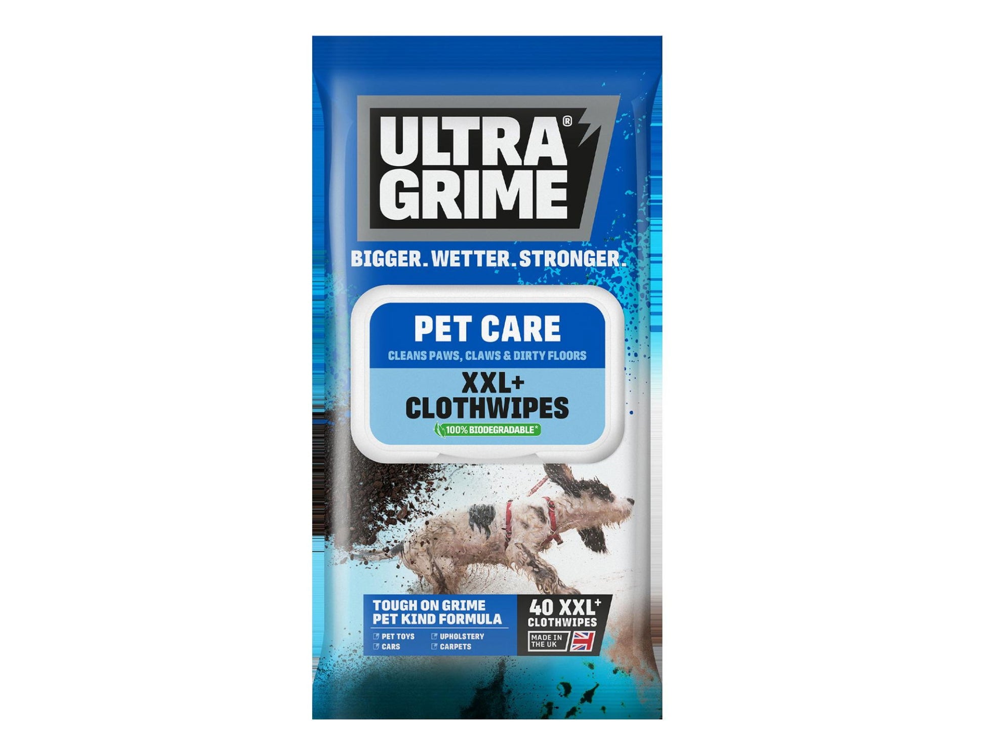 Keep your house and car clean by using UltraGrime Pet wipes to ensure your pet doesn’t bring the mud and dirt where it’s not welcome. Bigger, wetter and stronger than regular wipes, these XXL+ Clothwipes keep your pet and home clean – our smaller 40 pack size are perfect for quick on-the-go clean ups!