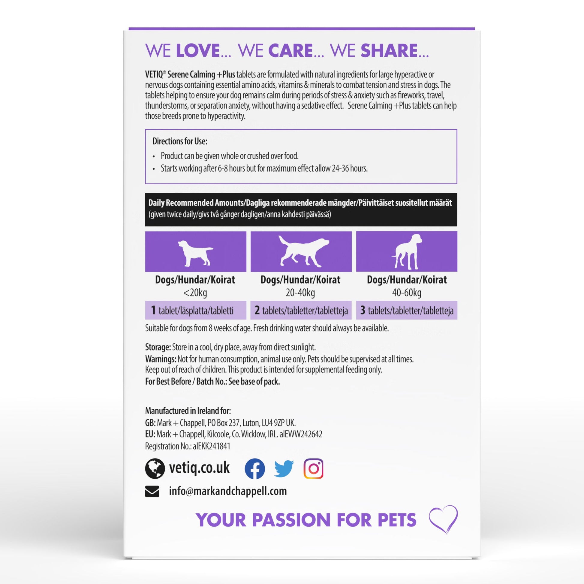 VETIQ ® Serene Calming +Plus tablets are formulated with natural ingredients for large hyperactive or nervous dogs containing essential amino acids, vitamins & minerals to combat tension and stress in dogs. The tablets helping to ensure your dog remains calm during periods of stress & anxiety such as fi ¬reworks, travel, thunderstorms, or separation anxiety, without having a sedative effect. Serene Calming +Plus tablets can help those breeds prone to hyperactivity Naturally calms and soothes dogs for Poor Behaviour, Hyperactivity, Home Alone, Fireworks, Thunderstorms, Travel Anxiety, Excessive Barking VETIQ Serene Calming tablets are highly digestible tablets, which can be given whole or crushed over food. Starts working from 6-8 hours but for maximum effect allow 24-36 hours. Dosage Guide Dogs <20kg, 1 tablet twice daily Dogs 20-40kg, 2 tablets, twice daily Dogs 40-60kg, 3 tablets twice daily