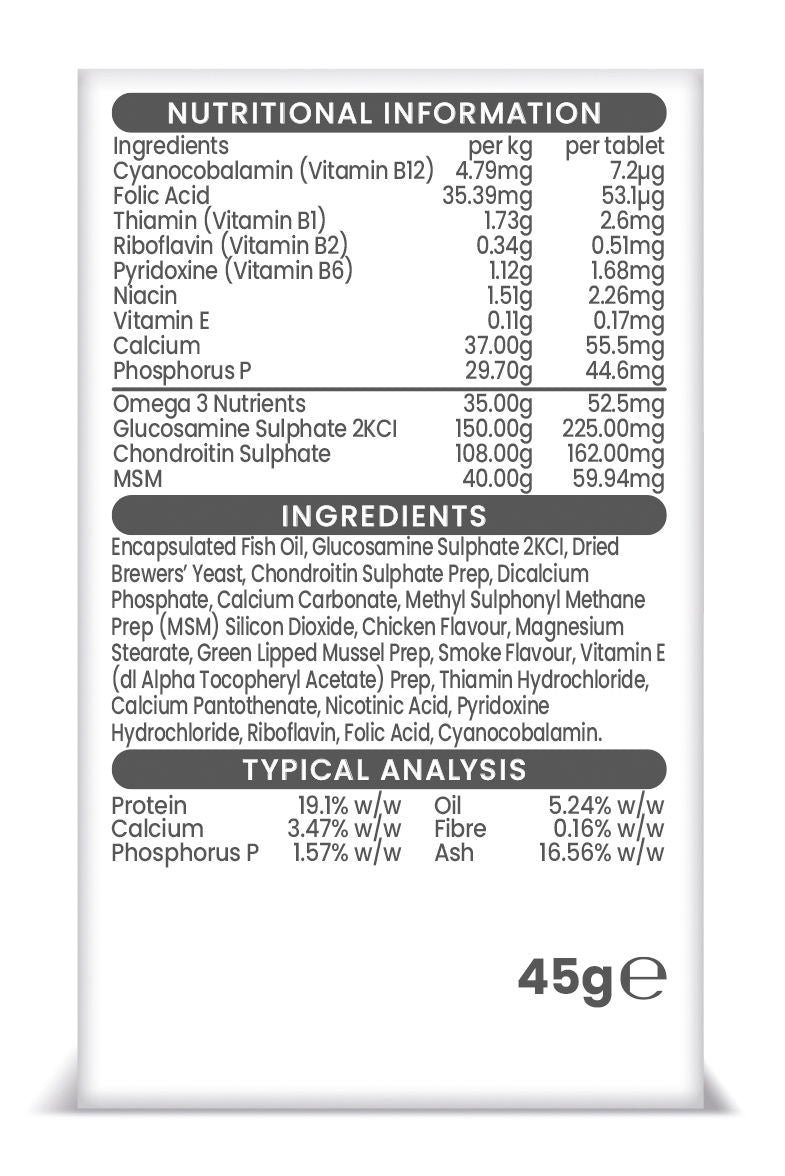 Vetzyme High Strength Flexible Joint With Glucosamine, Chondroitin, Msm And Omega 3 Helps Promote Pain-Free And Mobile Joints You See The Signs, The Dog Has Trouble Getting To Its Feet And Struggles Getting Up The Stairs. Ideally, Before These Signs Develop, Take Action To Help Maintain Your Dog’S Joint Health. Vetzyme High Strength Flexible Joint Has Been Specifically Formulated To Help Maintain Pain-Free, Supple And Mobile Joints, Helping To Ensure Your Dog Has A Better Quality Of Life As It Enters Its Golden Years. How It Works – The Key Ingredients Fish Oil (Omega 3) Research Has Indicated That Increased Levels Of Omega 3 Will Help Maintain: Pain-Free Supple Joints Healthy And Flexible Joints A Healthy Heart And Circulation Glucosamine And Chondroitin Are Amino Sugars, They Will Help: In The Formation And Rebuilding Of Cartilage, Tendons And Ligaments Maintain Healthy Joint Cartilage, Tendons And Ligaments Lubricate The Joints Enabling Easier Movement Msm (Methyl Sulphonyl Methane) Is Rich In Organic Sulphur And May Help: Maintain Elasticity And Healthy Movement In The Joints Maintain Healthy Connective Tissue Keep Joints Flexible And Muscles Supple B-Complex Is A Group Of Water-Soluble Vitamins And A Daily Intake Is Required To Help Promote: A Shiny Healthy Coat And Guard Against Nervousness Fitness And Vitality And Help Release Energy To Muscles Regular Use Will Help Give The Less Mobile Dog The Best Chance Of Maintaining A Healthy, Happy, Active Life. Ideal For: Senior Dogs All Dogs Puppies Over Twelve Weeks Feeding With All Pet Food Dogs Prone To Bad Joint Problems