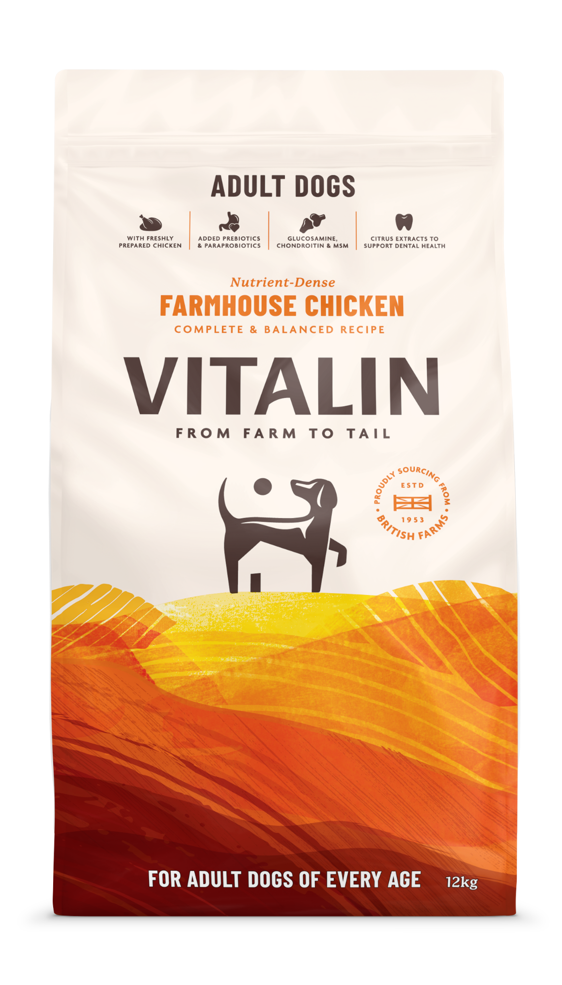Our Farmhouse Chicken recipe includes freshly prepared chicken, thyme, potato, peas, carrot, parsnip, and a tasty gravy. Added prebiotics & paraprobiotics help to support healthy gut function and glucosamine, chondroitin & MSM support joint health. Our Farmhouse Chicken recipe contains citrus extract to help support dental health and is suitable for adult dogs of every age, including seniors. With recyclable packaging and our handy reseal, the last bowl will be as fresh as the first, delivering holistic vitality from farm to tail.