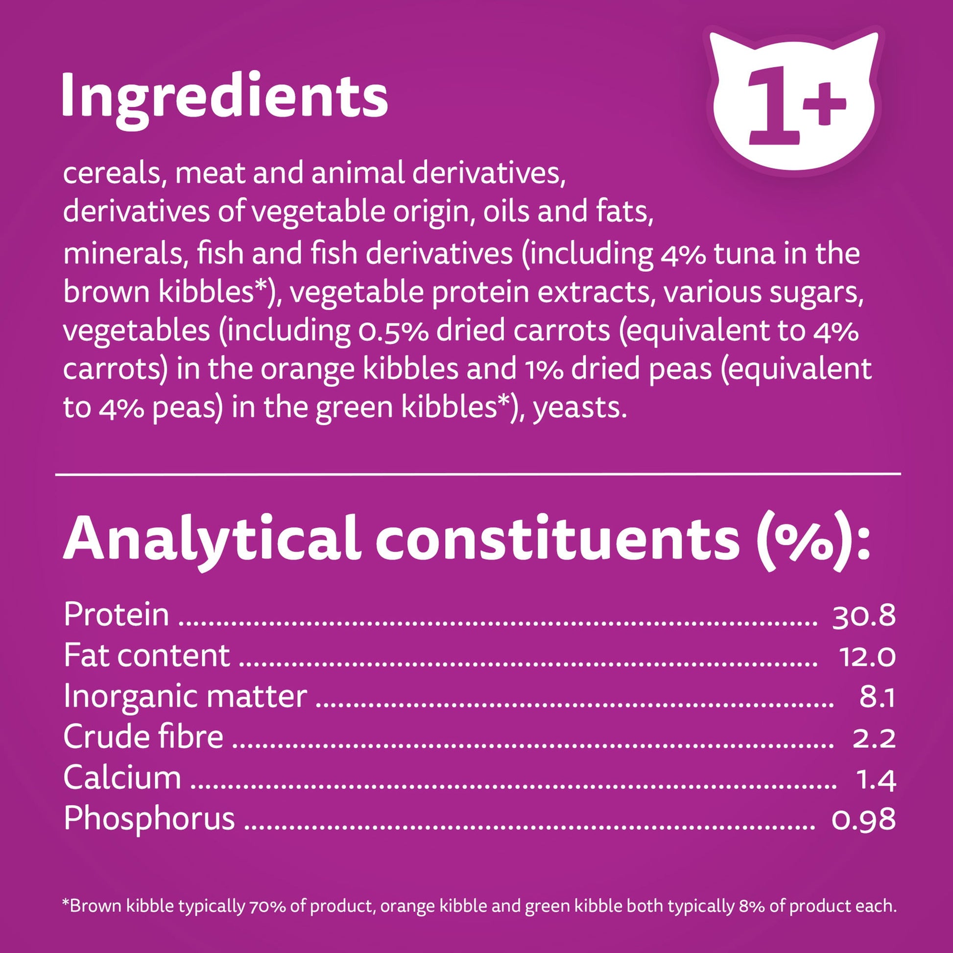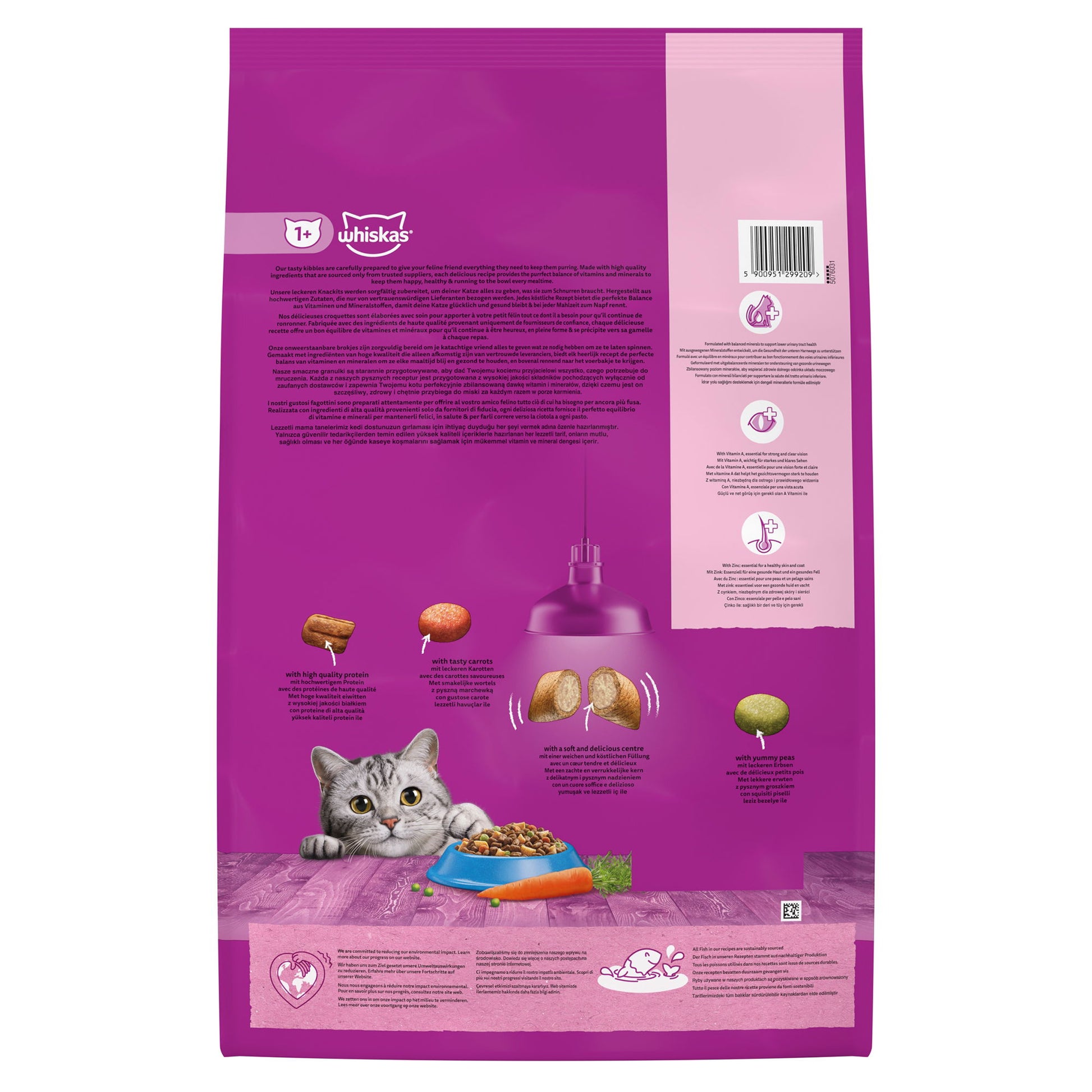 Whiskas 1+ Dry cat food is a nutritionally complete and balanced meal for your adult feline. This adult cat food contains tasty filled pocket kibbles they will love - crunchy on the outside with a soft and delicious centre. Whiskas 1+ quality dry cat food provides everything your adult cat nutritionally needs for a long and happy life. Whiskas delicious cat food meals and cat treats are formulated for your cat's diet. A 100% Complete and Balanced cat food of Tuna dry cat kibbles. This 7kg Whiskas dry cat food for adult cats has tasty filled pockets your feline friend will love.