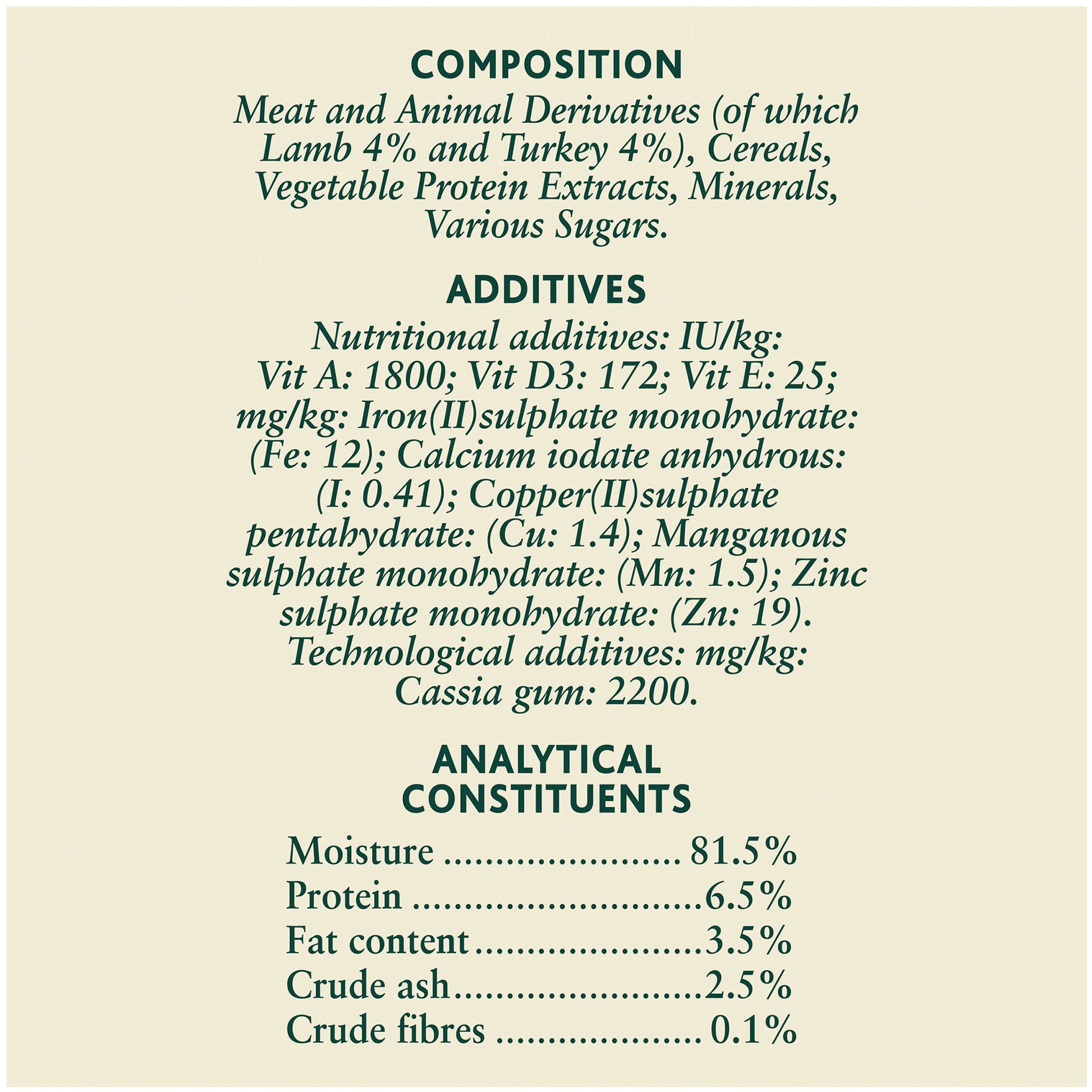 Complete pet food for adult dogsNo added colourantsHelps to maintain healthy eyes and skinHelps to maintain strong and healthy bonesHelps to maintain vitalityMeat and animal derivatives (of which Lamb 4% and Turkey 4%); cereals; vegetable protein extracts; minerals; various sugarsMoisture: 81.5%; Protein: 6.5%; Fat content: 3.5%; Crude ash: 2.5%; Crude fibre: 0.1%. IU/kg: Vit A: 1800; Vit D3: 172; Vit E: 25;