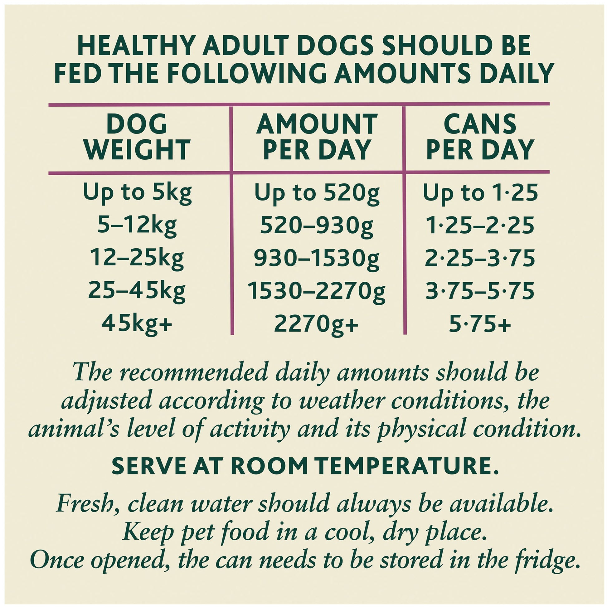 Dog Weight: Amount per day: Cans per day: Up to 5 kg Up to 520g Up to 1.25 5 – 12 kg 520 – 930 g 1.25 – 2.25